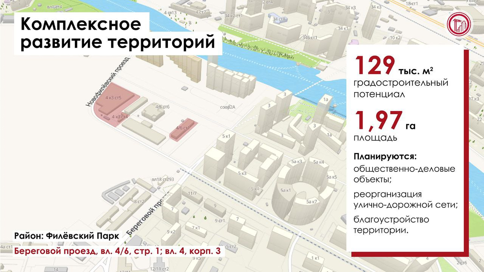 Ранее мэр Москвы Сергей Собянин одобрил проект КРТ в районе Филёвский Парк, предусматривающий развитие двух участков в Береговом проезде.