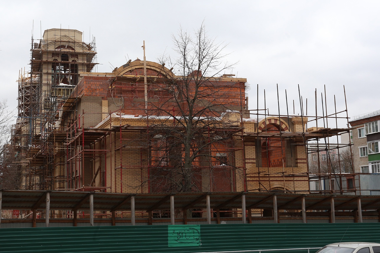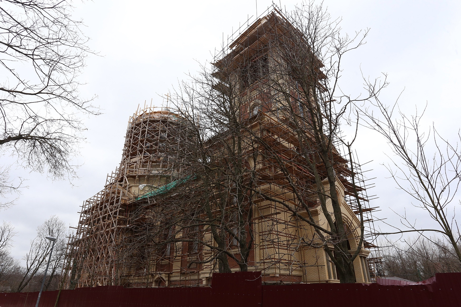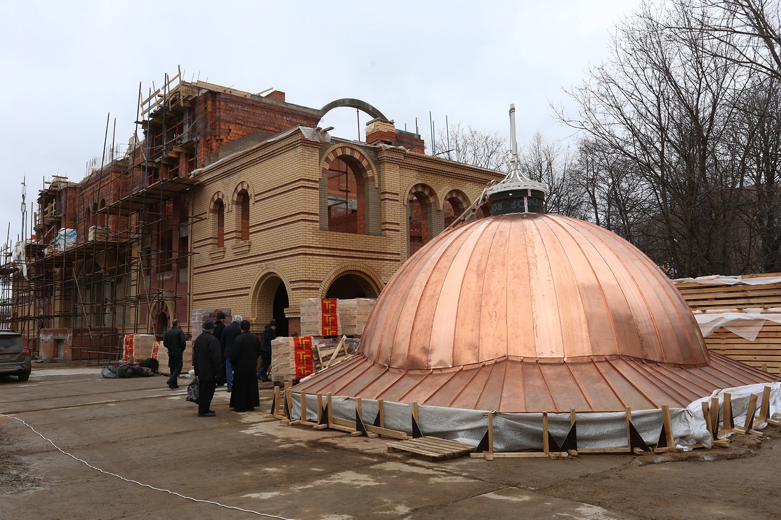 Главное здание храма уже готово, ведутся сложные работы по обрешетке большого купола, после чего он будет покрыт медью. Сейчас усилия строителей направлены на монтаж кровли и электрики главного храма.