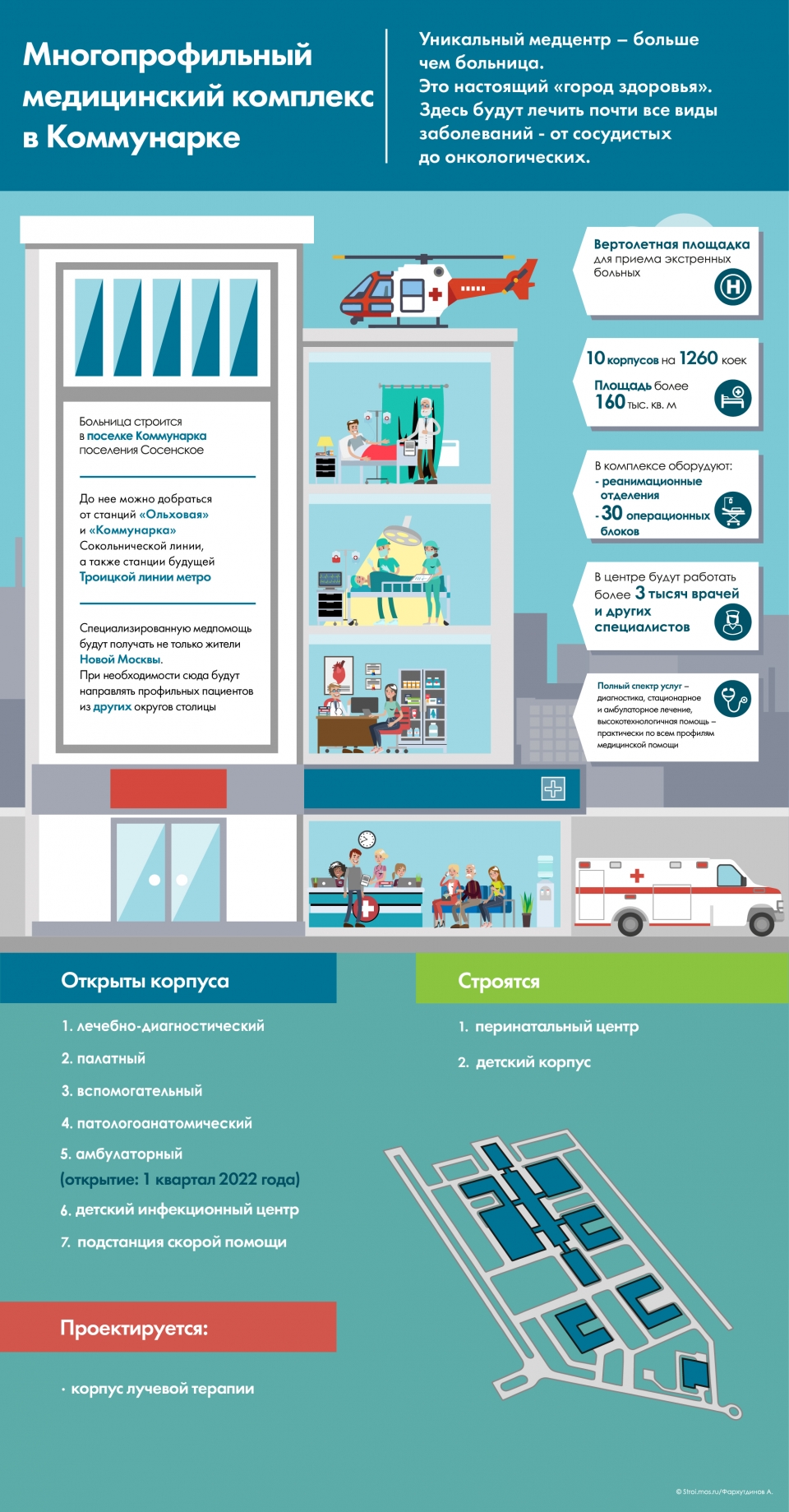«Технологии, собранные в Коммунарке, одни из лучших в мире. Две трети клиники уже построено и введено в эксплуатацию. Строятся два корпуса – перинатальный и детская больница. На 2023 год останется спроектированное уникальное здание лучевой терапии, в котором будут сконцентрированы самые современные технологии», – отметил мэр.