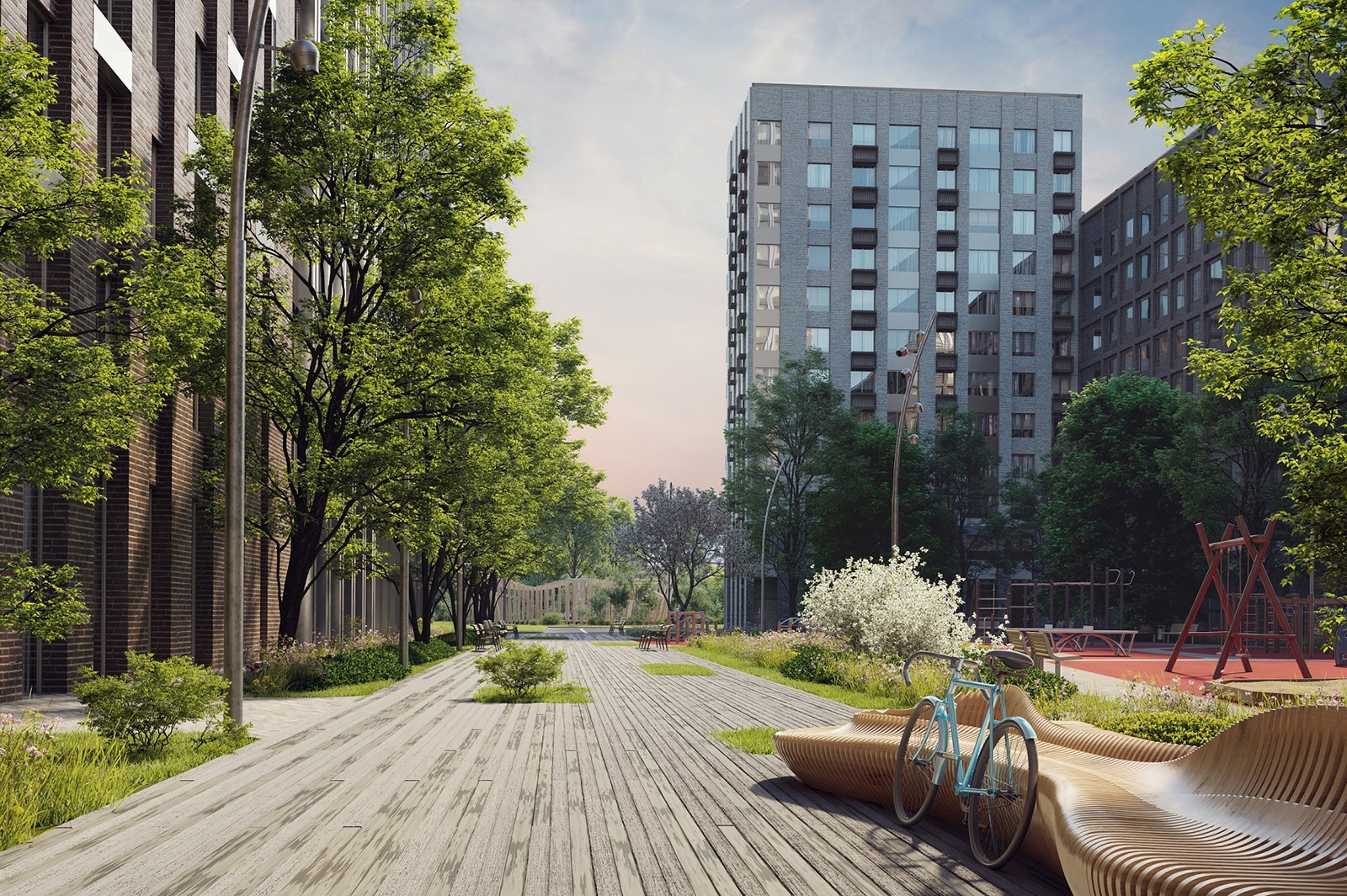Пространство первых этажей станет площадкой для времяпрепровождения и социализации жителей. На территории предусмотрено все для жизни, работы и отдыха: парк, камерные дворики, магазины, кафе, объекты образования, медицины, спорта.