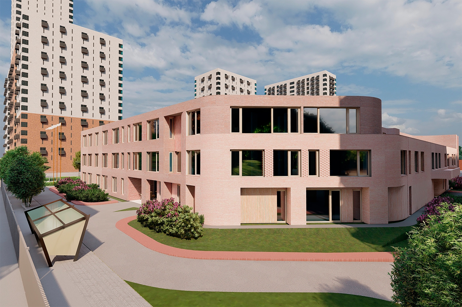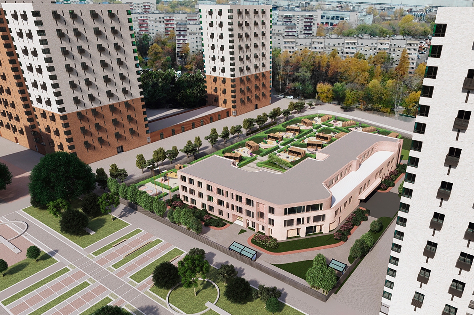 Детский сад имеет Г-образную форму. Сочетание разных типов кирпичной кладки и игра паттернов на фасаде напоминает полотно, сшитое из разных кусков ткани. Такой необычный рисунок позволяет зданию выглядеть современно и гармонично вписаться в ландшафт Матвеевского кластера.