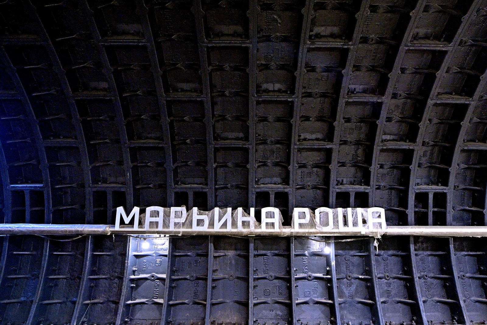 На «Рижской» основной составляющей архитектурной концепции стали металлические арки-порталы со светодиодной подсветкой по краям.