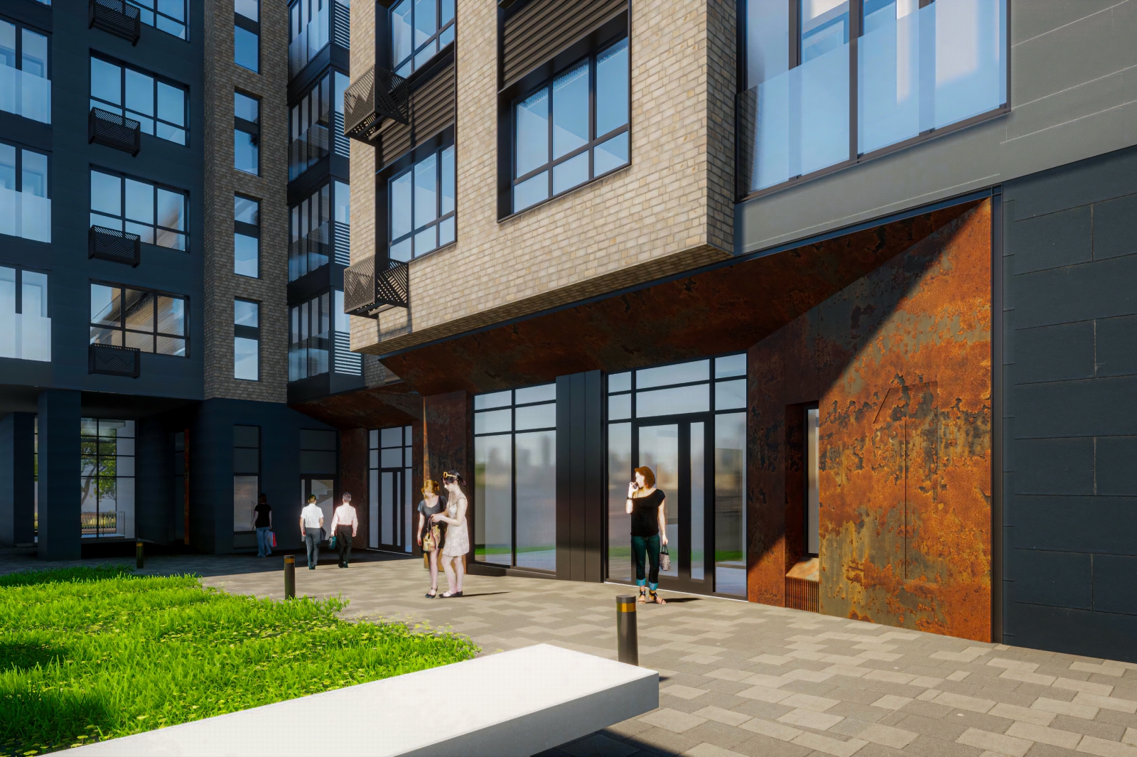 Вход в здание, полы вестибюлей и лифтовых холлов на первых этажах выполнят на уровне земли для удобства родителей с колясками и маломобильных людей. Препятствовать скольжению в любое время года будет плитка с шероховатой поверхностью у входной группы дома.
