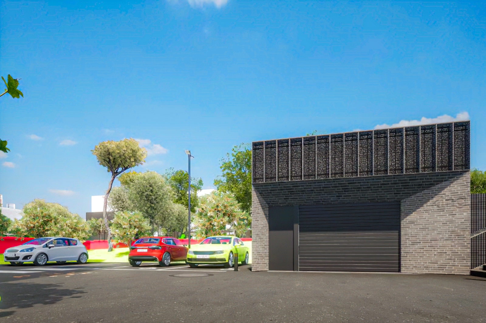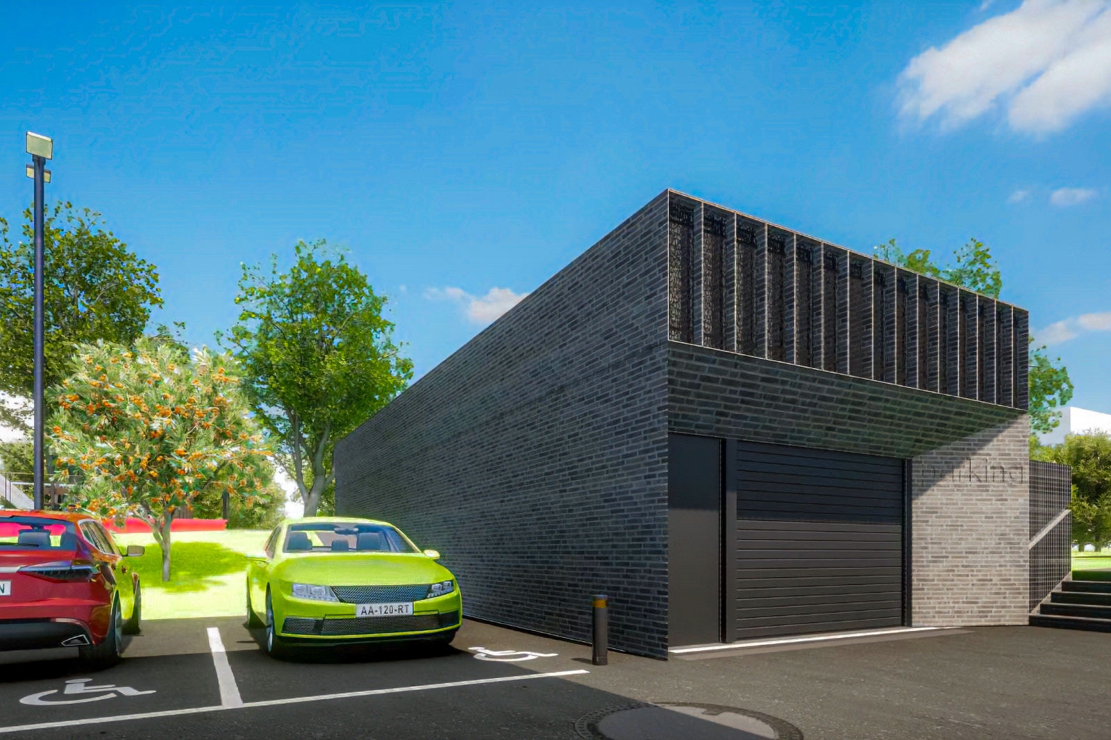 Фасады дома облицуют бетонной плиткой и архитектурным бетоном. На них установят металлические корзины для кондиционеров. Входные группы оформят витражным остеклением.