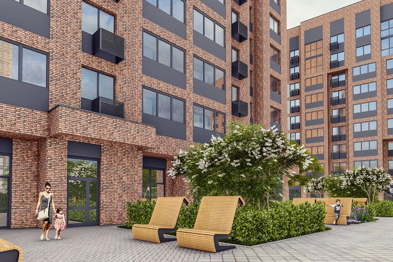 Фасад облицуют керамической плиткой «под кирпич» натуральных оттенков и темно-серыми фиброцементными плитами. Во всех квартирах появятся застекленные лоджии, установят корзины для кондиционеров.