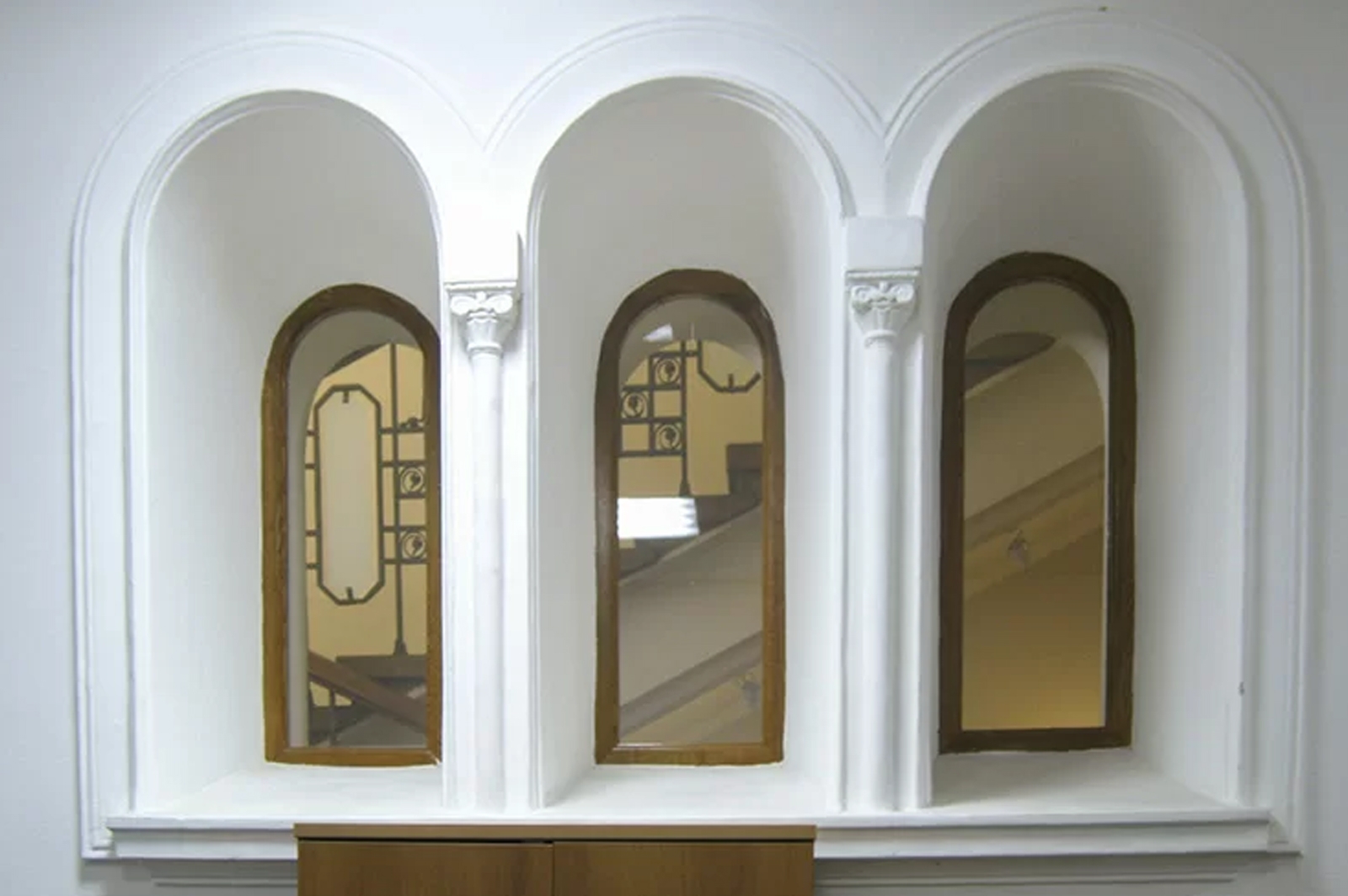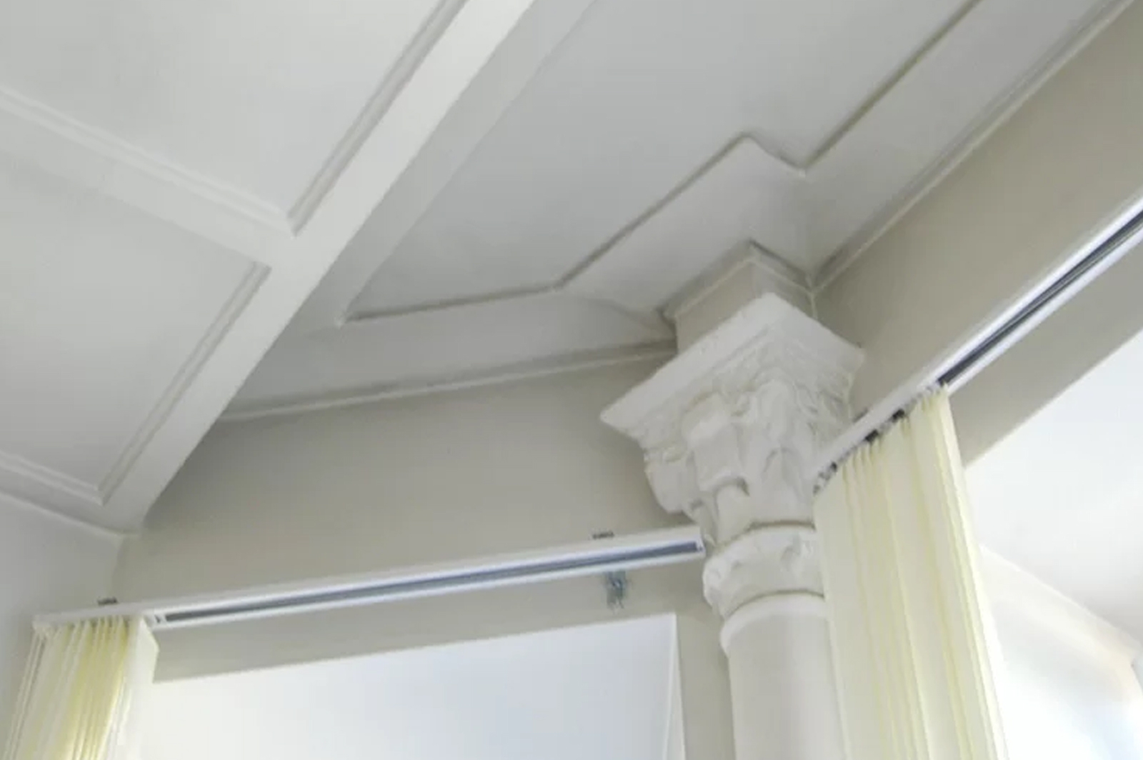 В некоторых помещениях уцелела лепнина на потолках и стенах. Оконные проемы эркеров также украшены полуколоннами.
