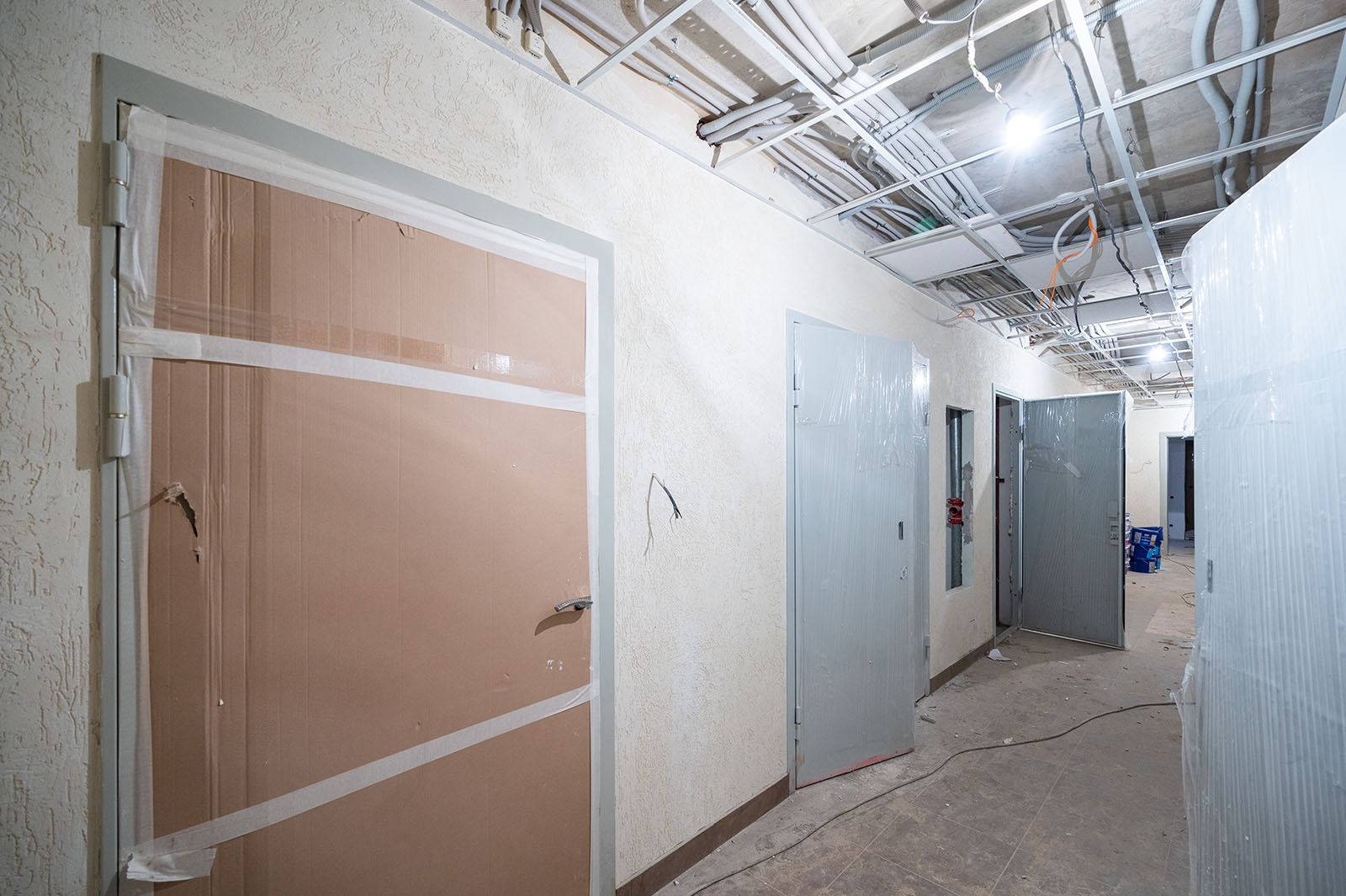 Вход в здание, пол вестибюля и лифтового холла на первом этаже выполнили в один уровень с поверхностью земли – мамы с колясками и маломобильные люди смогут без посторонней помощи попасть в подъезд. Плитка с шероховатой поверхностью у входной группы жилого дома будет препятствовать скольжению в любое время года.