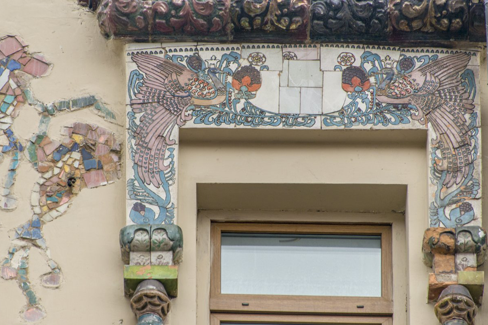 Декоративные вставки и изразцы можно увидеть и на стенах фасада. В некоторых местах они выполнены в виде пышных диковинных цветов. Кроме того, два окна на пятом этаже дома отделаны керамическими наличниками с изображением сказочных жар-птиц.