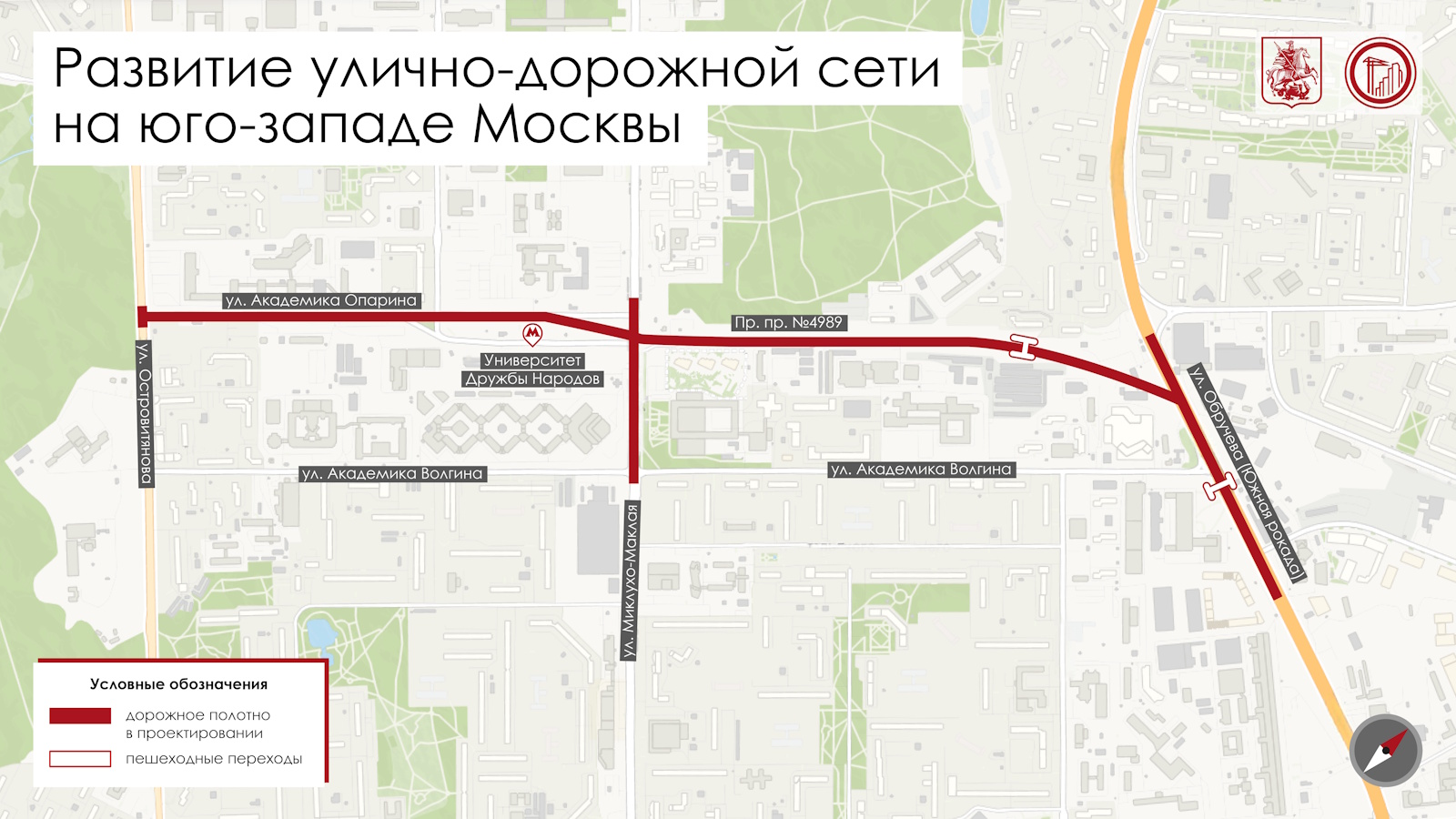 «В планах – строительство Проектируемого проезда № 4989, который продлит ул. Академика Опарина до ул. Обручева, а также возведение двух подземных пешеходных переходов. Помимо этого, предполагается реконструкция ул. Академика Опарина протяженностью 1,1 км. В результате появится дополнительная транспортная связь между ул. Островитянова и Южной рокадой», – сказал Владимир Ефимов.