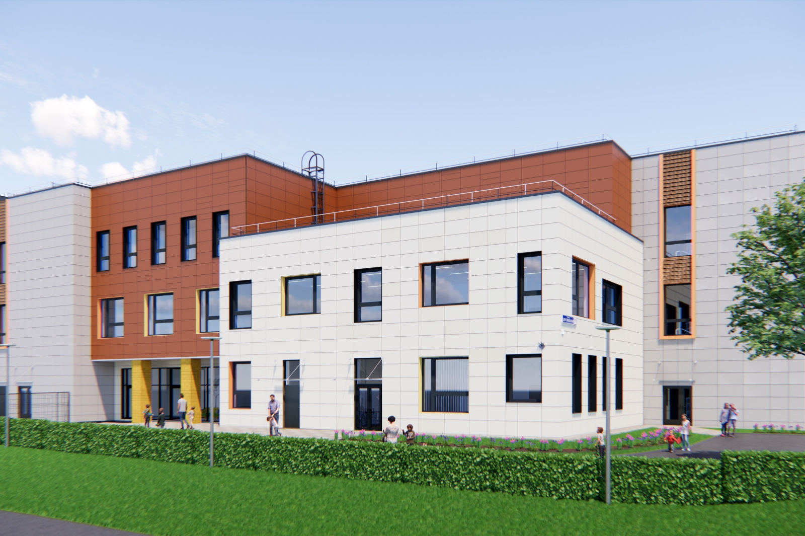 Продуман не только облик внутренних пространств здания, но и фасадов. Стены выполнили в светло-песочных оттенках, а часть оконных рам имеют ярко-желтые акценты. Для учащихся младших, средних и старших классов предусмотрены разные входы.
