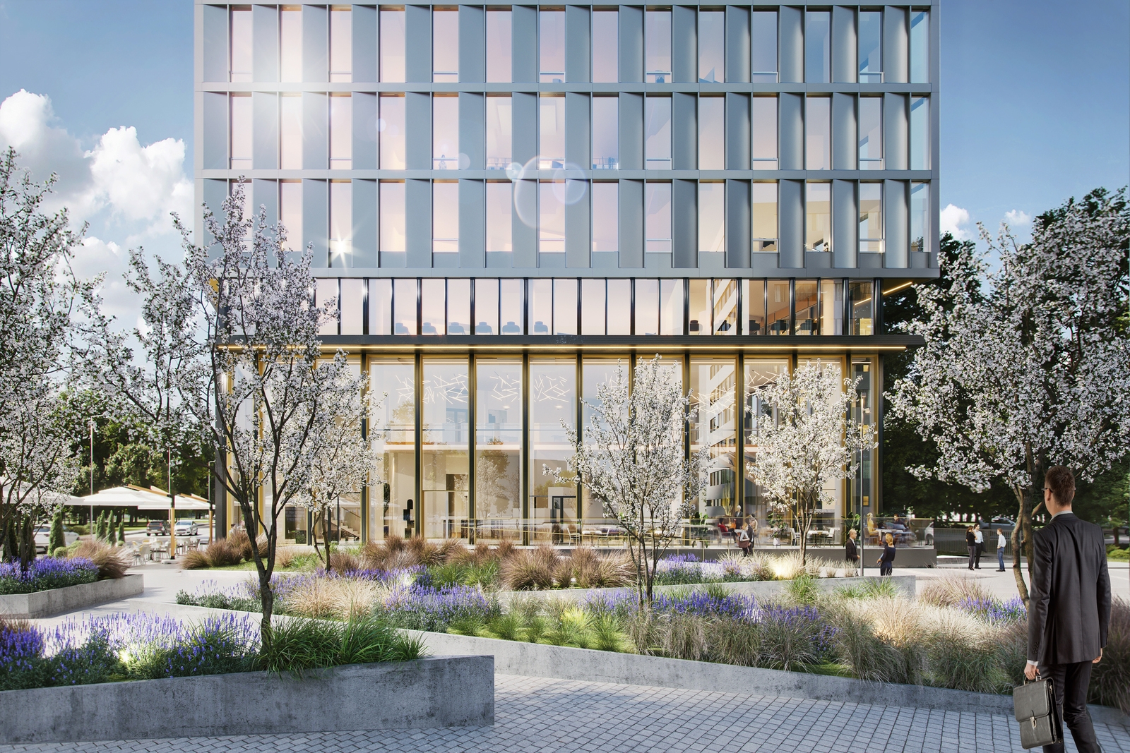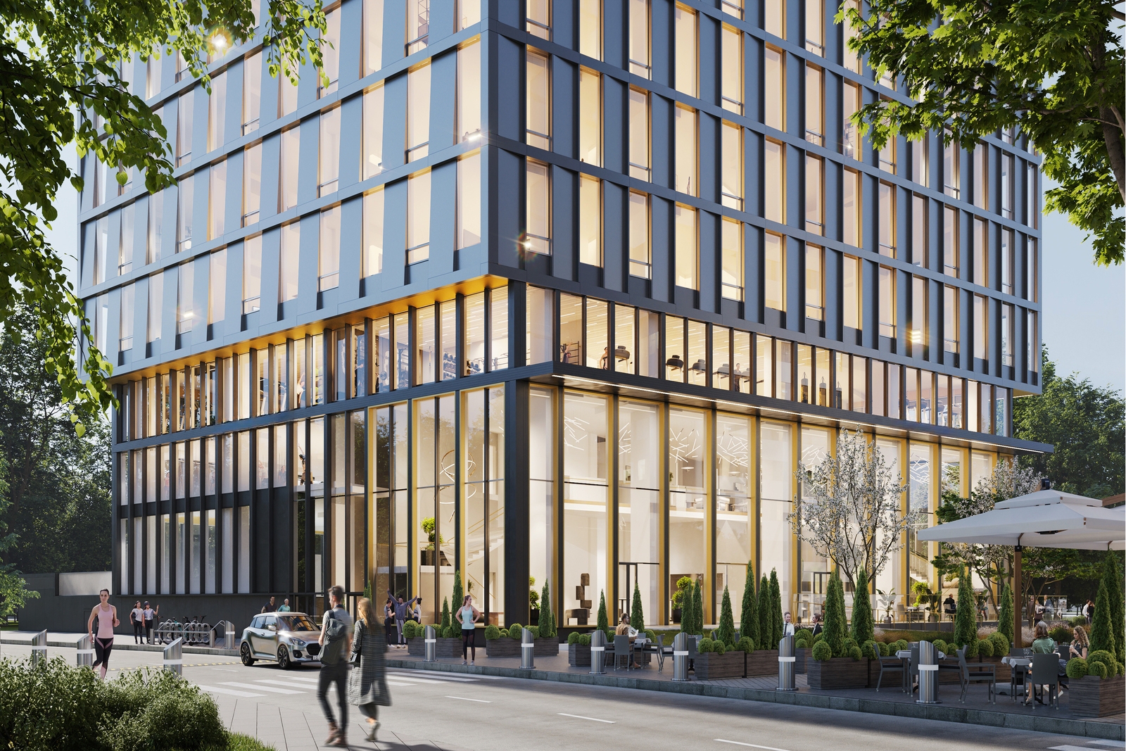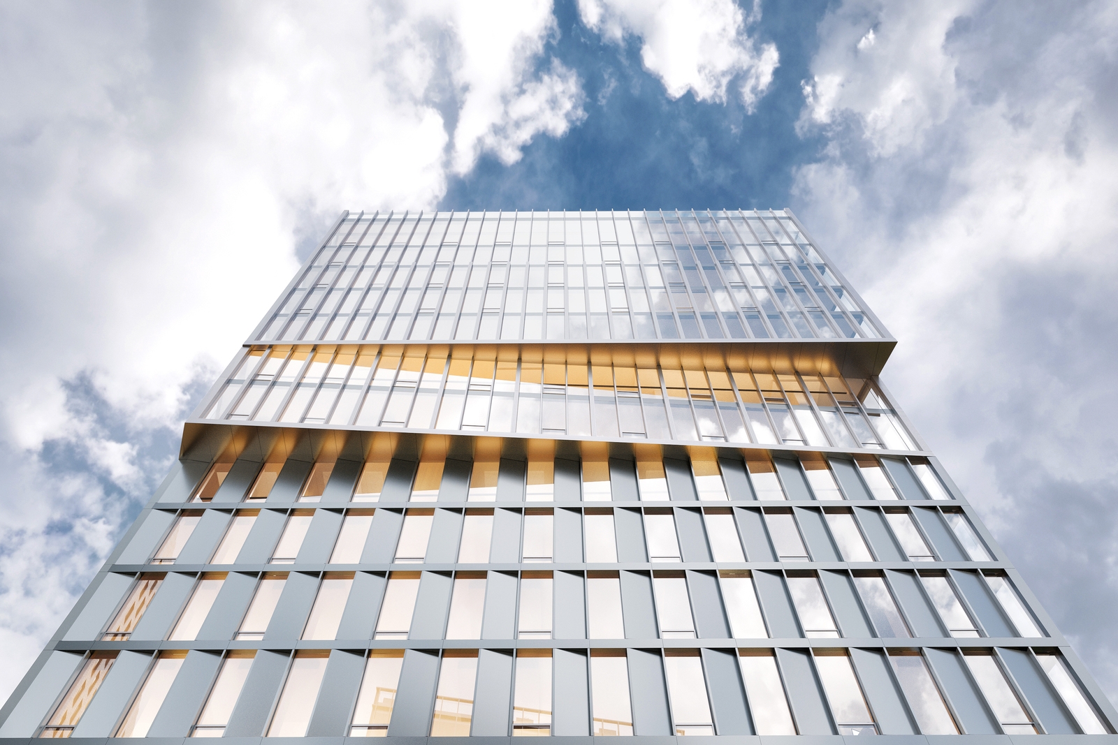 Уменьшаясь по высоте фасада, панорамное остекление при этом увеличивается, что подчеркивает видовой характер этажей. Для исполнения фасадов нижней части здания были выбраны контрастные панели в металлическом оттенке.