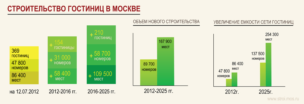 Строительство будет осуществляться в две очереди. С 2012 по 2016 год планируется построить 154 гостиницы на 58,4 тыс. мест. В рамках второй очереди, с 2017 по 2025 год, планируется возвести 210 гостиниц на 109,5 тыс. человек. Из них на присоединенных территориях в составе капитальных объектов будет введено 7 тыс. гостиничных номеров на 14,1 тыс. мест.