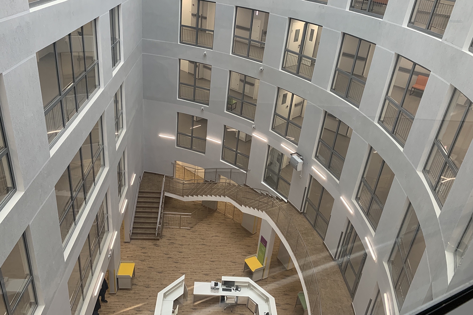 Установили лифты для посетителей и персонала. В здании обустроен многосветный атриум, заканчивающийся на кровле световым фонарем.