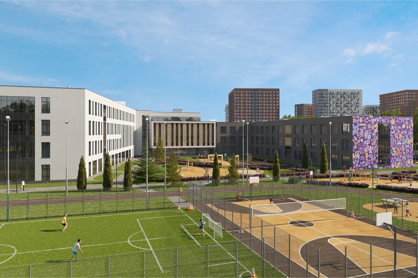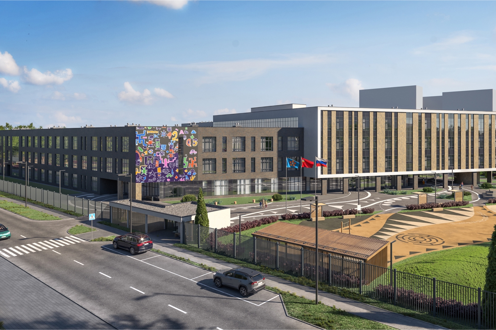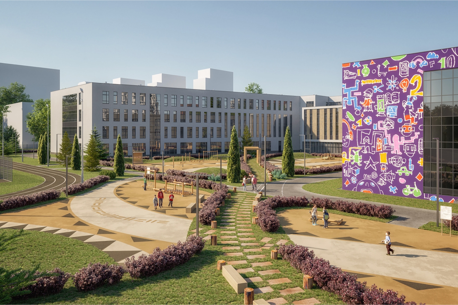 Он добавил, что территорию школы будет обустроена таким образом, чтобы ученики получили обширное пространство для занятий спортом и активного отдыха: здесь расположатся спортплощадки, столы для игры в пинг-понг и поля для командных игр.