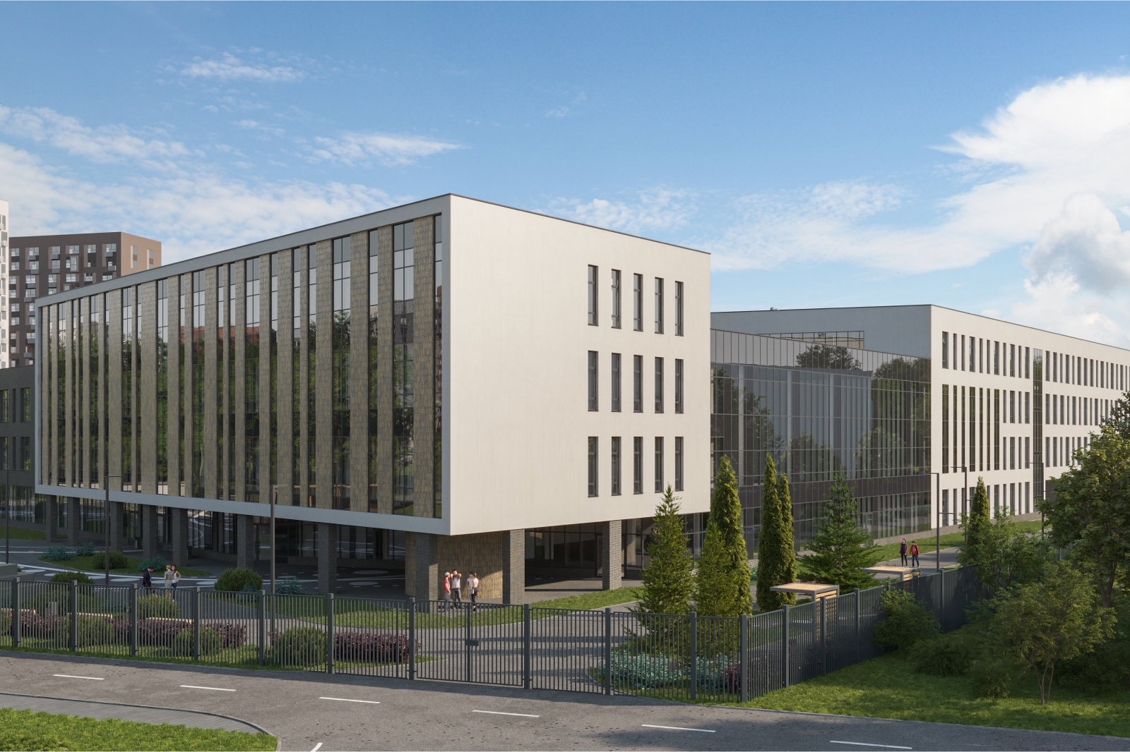Трехэтажный блок младшей школы облицуют керамической плиткой базальтового цвета. Лаконичное оформление этой части здания дополнят большими трехчастными окнами и витражами, которые обеспечат хорошую инсоляцию учебных помещений и придадут легкость фасадам.