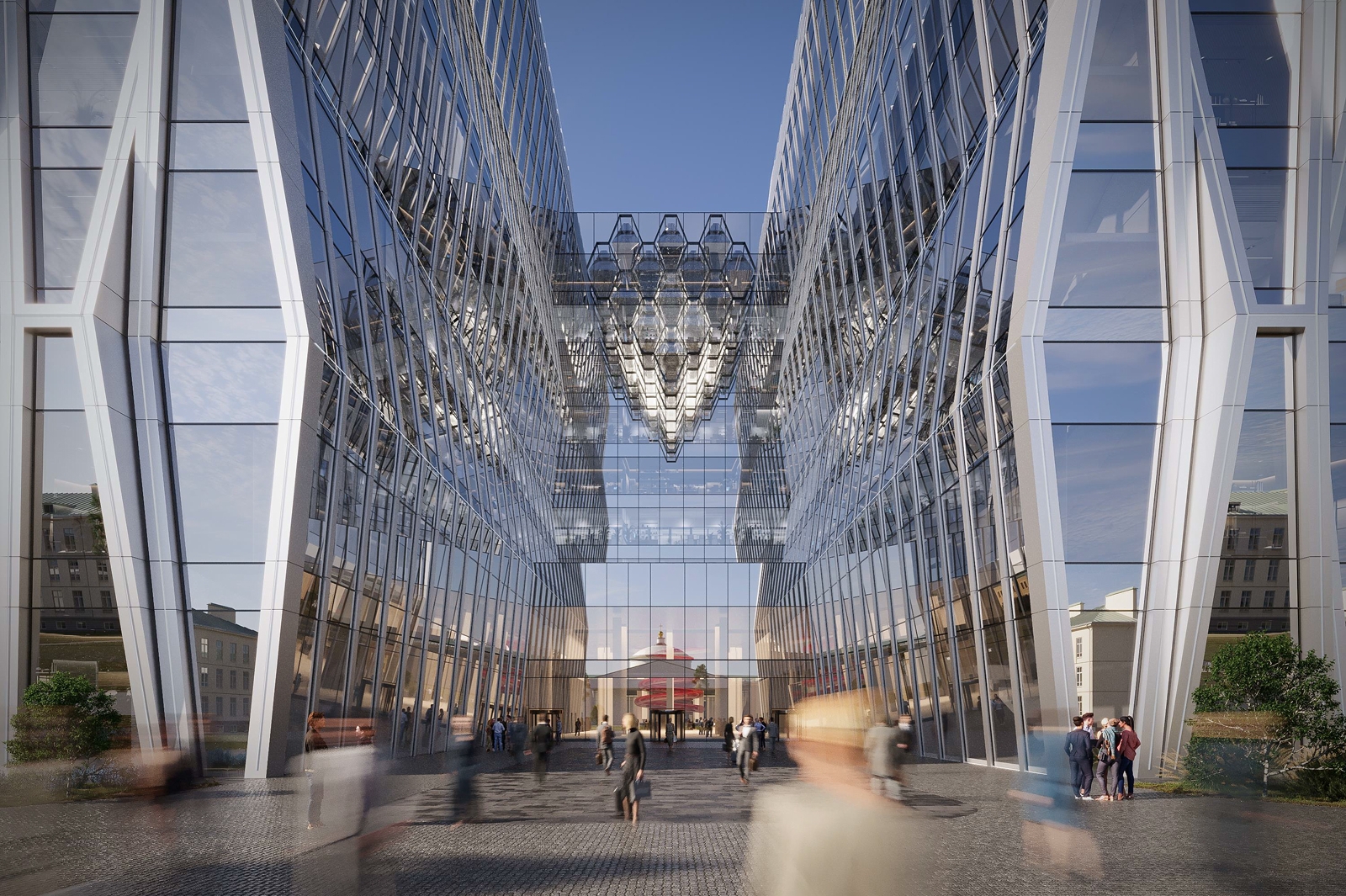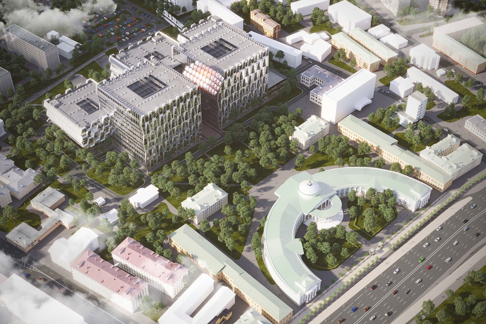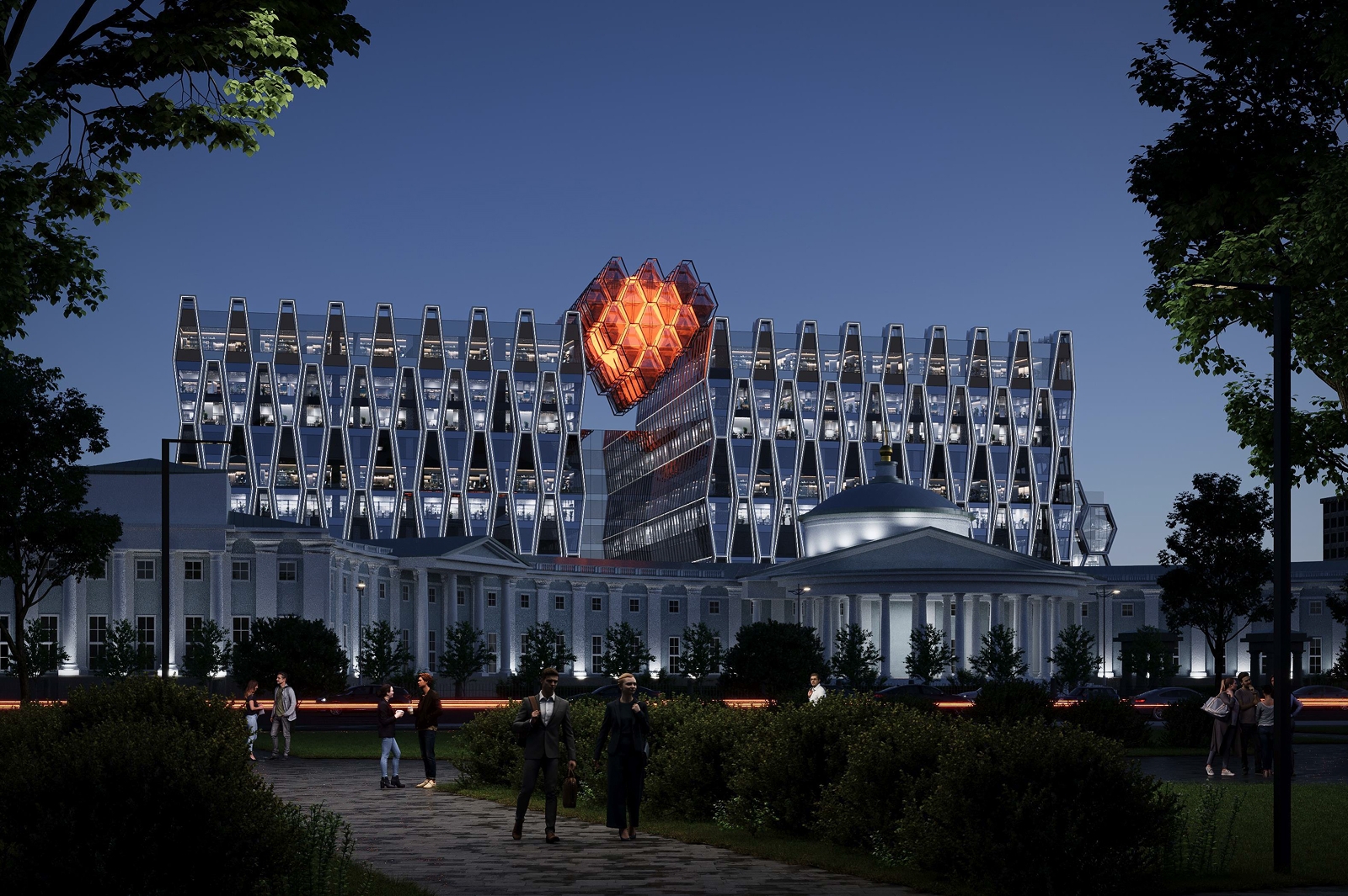 Согласно проекту, главный фасад обращен к парку и на историческое здание НИИ скорой помощи. Из-за разницы высот корпусов и различий в пропорциях «молекулярная решетка» со стороны Грохольского пер. будет напоминать соты, а с Садового кольца – фальконье – стеклянный кирпич, который был излюбленным материалом эпохи модерна и символом русской эстетики рубежа XIX–XX веков.