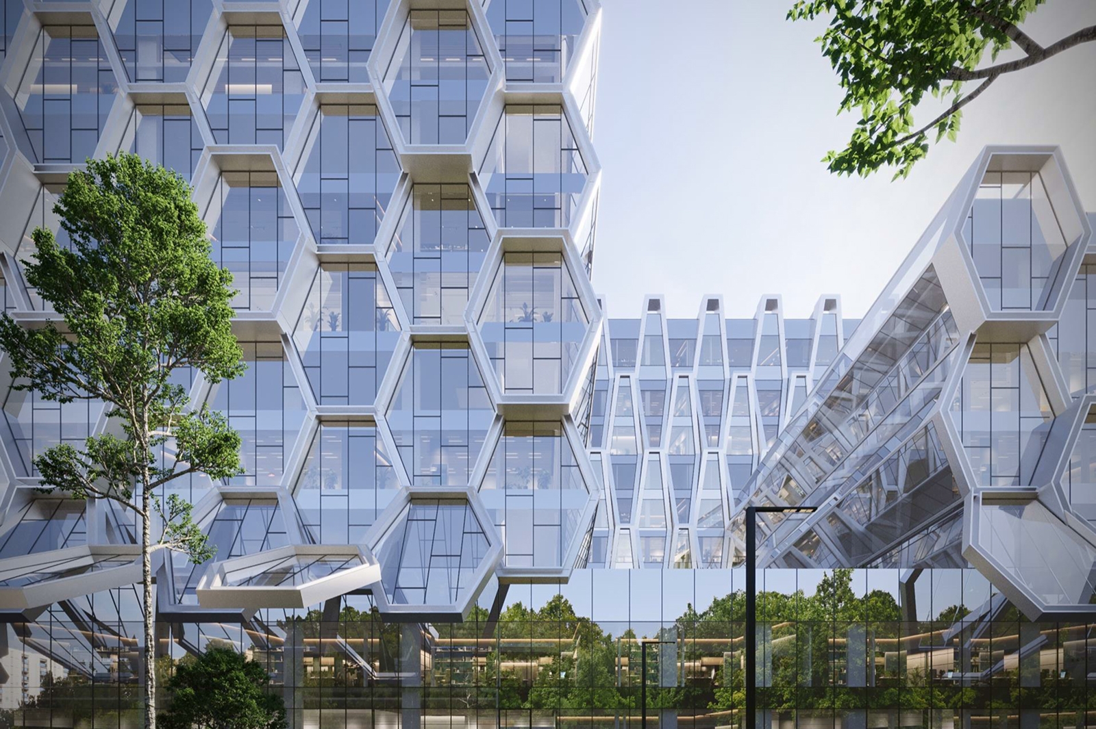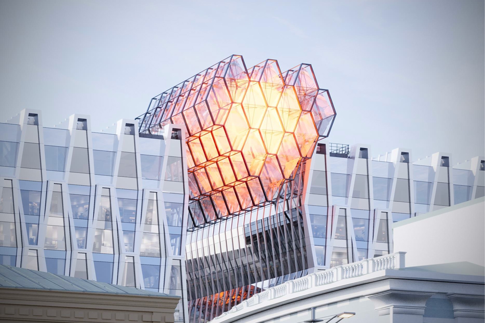 Каждую «соту» выполнят из современных материалов с учетом световых эффектов, что позволяет фасаду играть разными оттенками в зависимости от времени суток и освещения. Общая площадь декоративных элементов из алюмокомпозитных панелей составит около 80 тыс. кв. м.