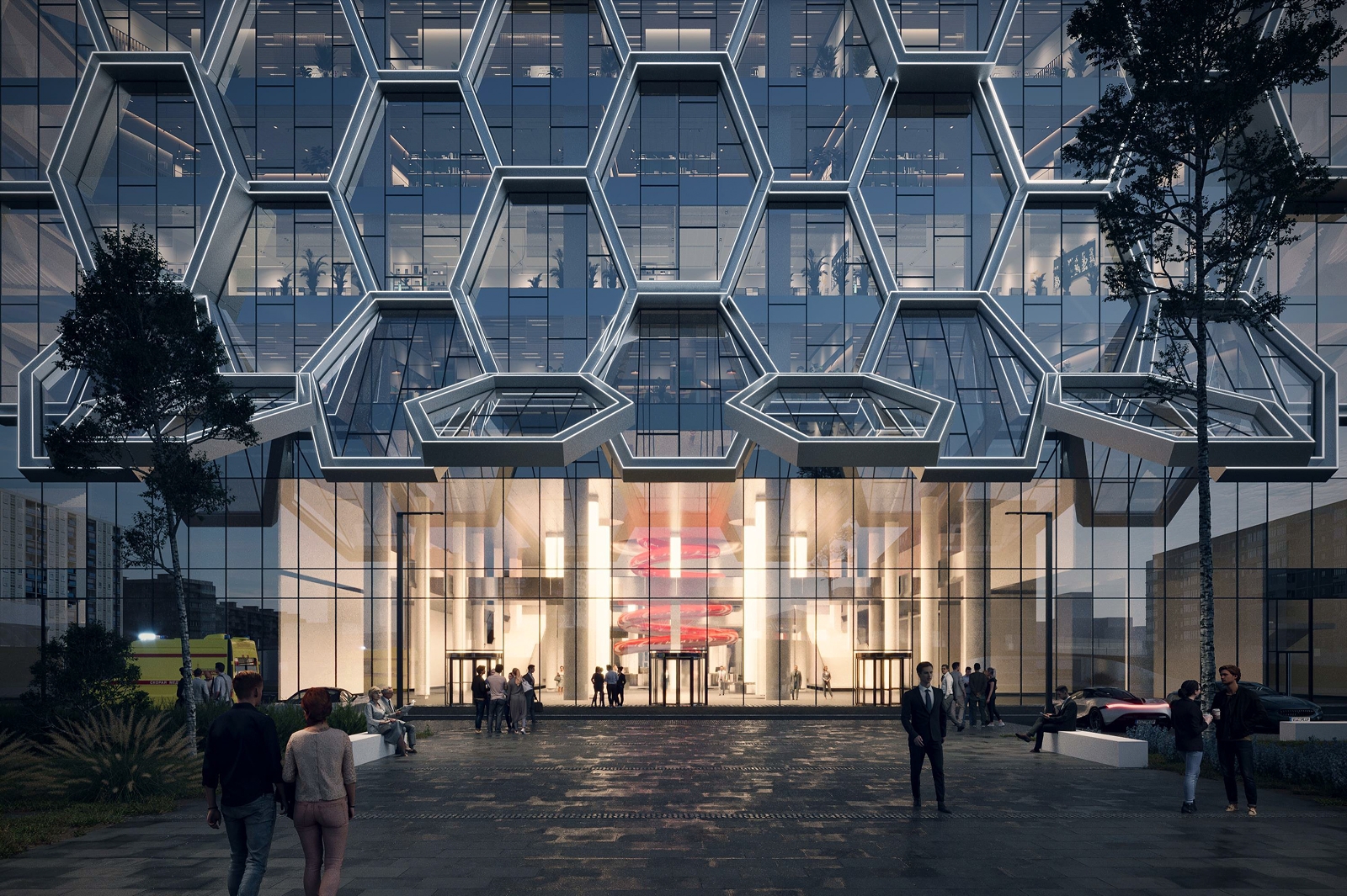 Арт-объект соберут из шестигранников – такой же визуальный прием реализуют на главных фасадах здания. Использование фрактальных форм подчеркивает концепцию бесконечности, гармонии и сложности природы, которая перекликается с идеей современного, технологичного и инновационного медучреждения.