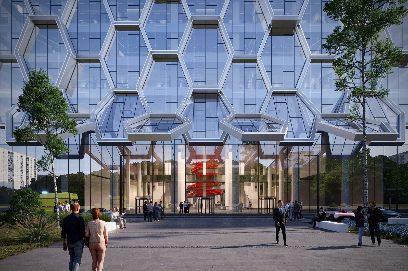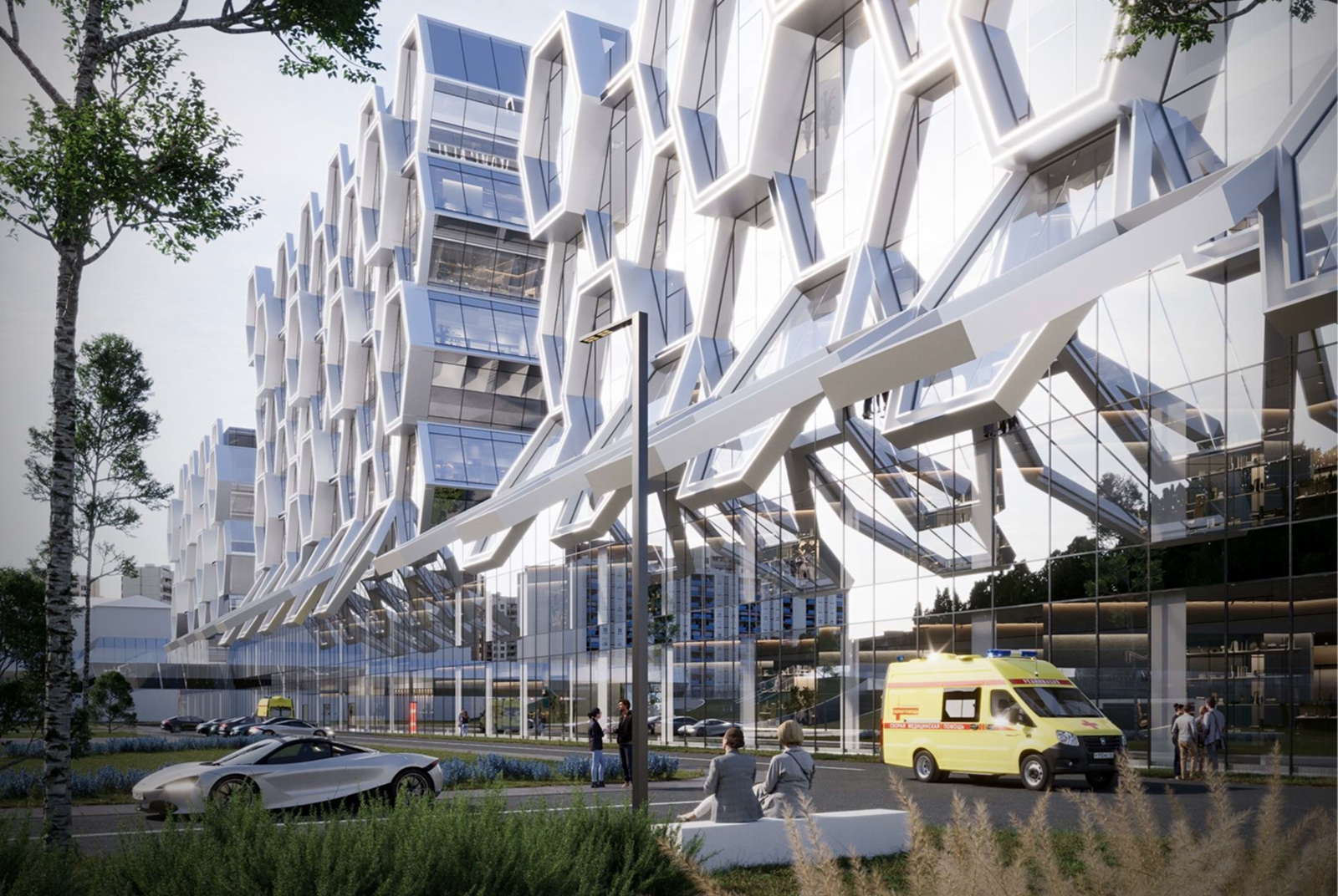 Визуально фасад будет состоять из шестигранных «сот», создающих эффект сложной химической структуры. Такой архитектурный образ подчеркивает научный подход и высокие технологии, используемые в медицине.