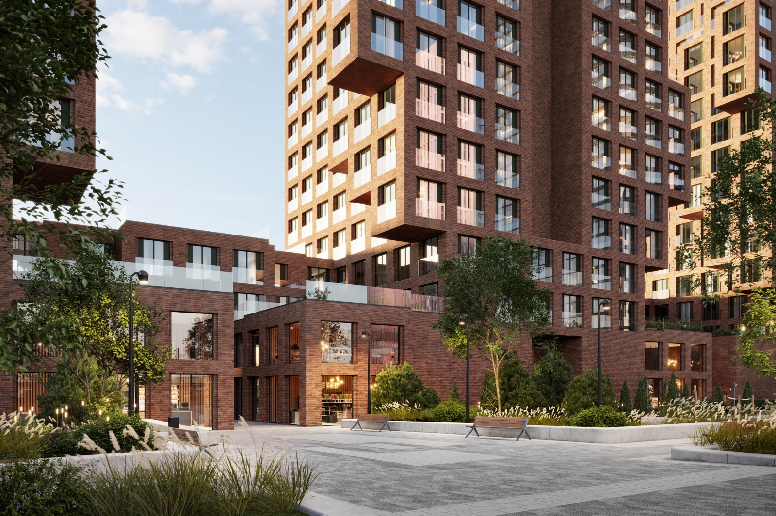 «Всего здесь будет 1438 квартир: 195 студий, 590 однокомнатных, 431 двухкомнатная, 178 трехкомнатных и 44 четырехкомнатные. На первых этажах появятся входные группы с вестибюлем, колясочной, помещениями с почтовыми ящиками и для ухода за питомцами. В нежилой части разместятся спортивная студия, кофейни, кафе и магазин», – сказал Иван Щербаков.