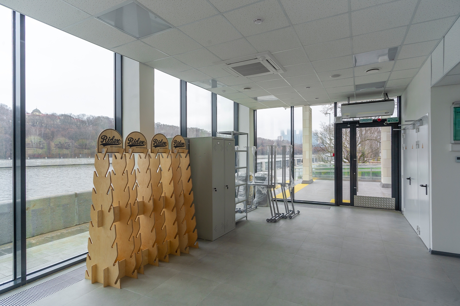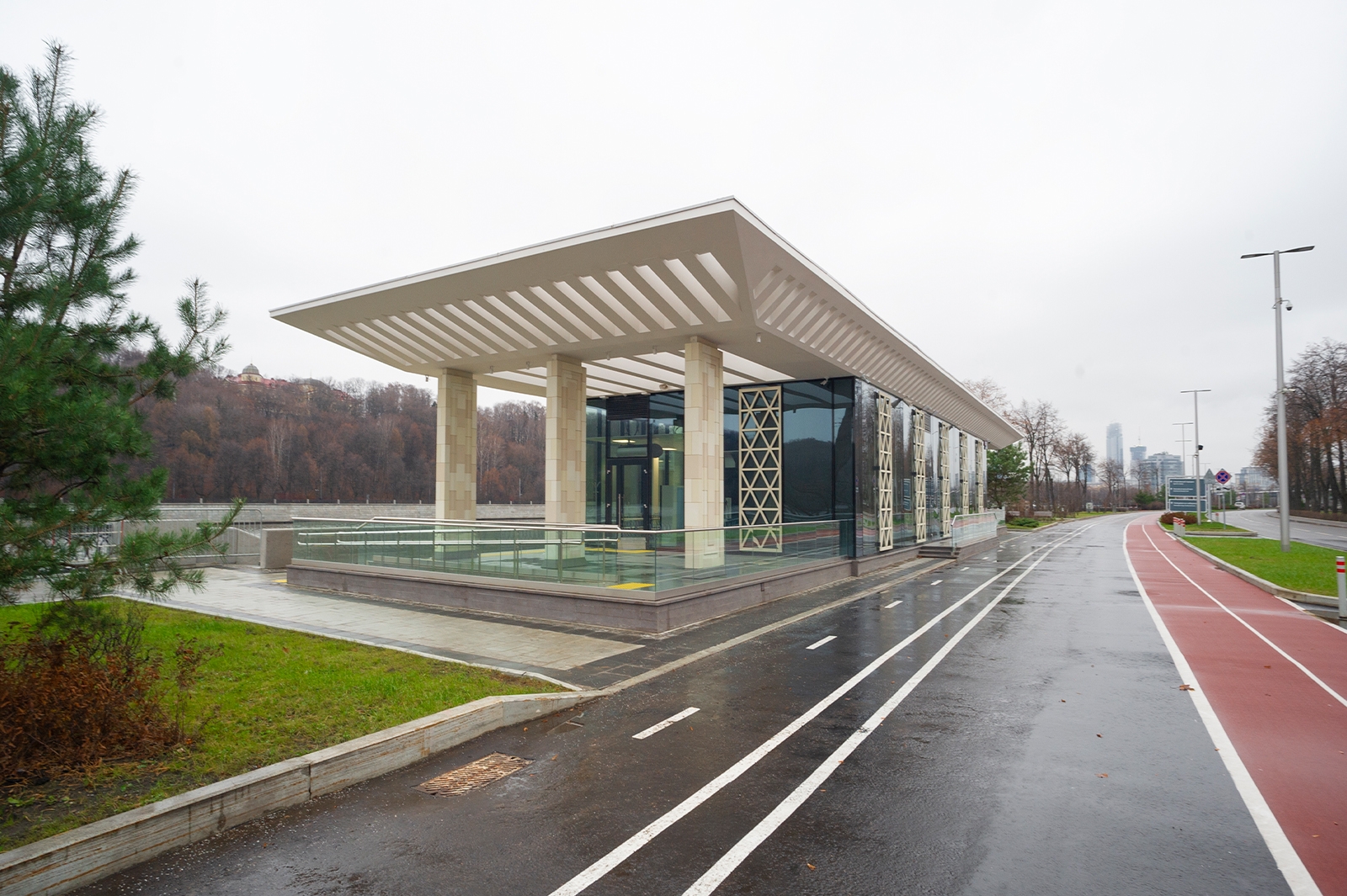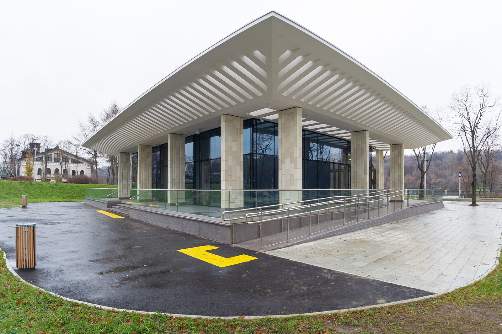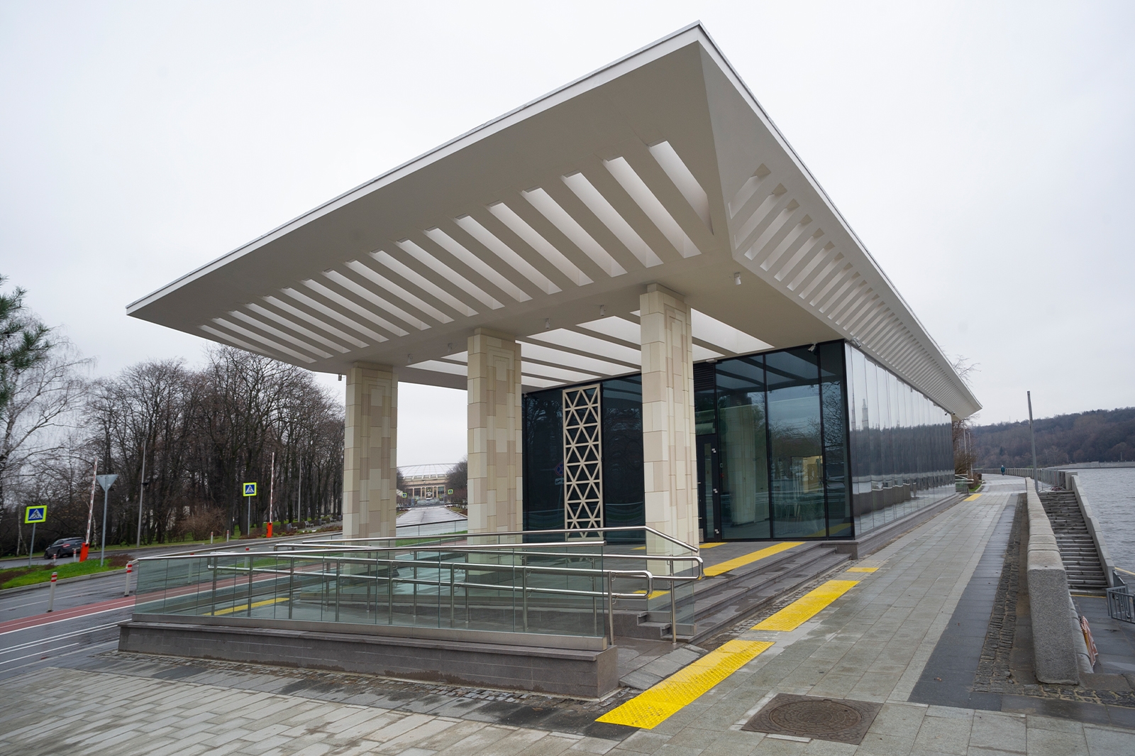Объемно-пространственная композиция каждого павильона строится на сочетании легкого стеклянного объема и открытых террас, объединенных кровлей. В зоне террас кровля поддерживается пилонами с геометрическим рисунком, отсылающим к архитектуре исторического ансамбля зданий Олимпийского комплекса «Лужники» 1950-х годов.