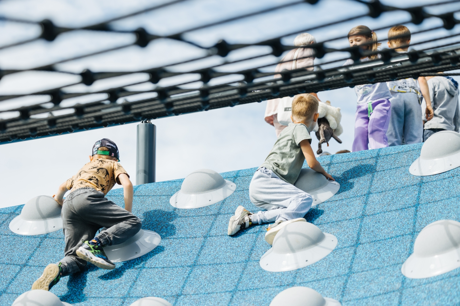 Он отметил, что сердцем площадки стал большой асимметричный холм с кратером внутри, где есть сетка для лазания, скалодром и горка. Пространство вокруг холма покрыто натуральной галькой, а через тоннели в его склонах можно попасть в кратер.
