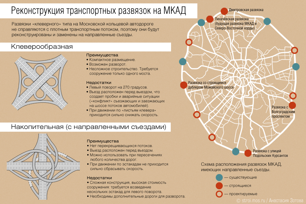 В ближайшие три года в столице планируется реконструировать тринадцать действующих развязок на пересечениях МКАД с основными магистралями, чтобы разгрузить эти напряженные транспортные узлы. Впоследствии все развязки на кольцевой подвергнутся глобальной мощной реконструкции, за исключением тех, которые имеют конструкцию направленных съездов (например, развязки, построенные на пересечении с Ярославским и Новорижским шоссе).