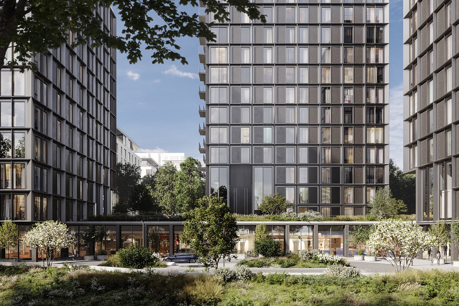Чтобы эффектно интегрировать корпуса в сложившуюся эклектичную застройку улицы Мосфильмовская, архитекторы AI Studio расположили самый низкий корпус ближе к фронту улицы, а самую высокую башню – в глубине площадки.