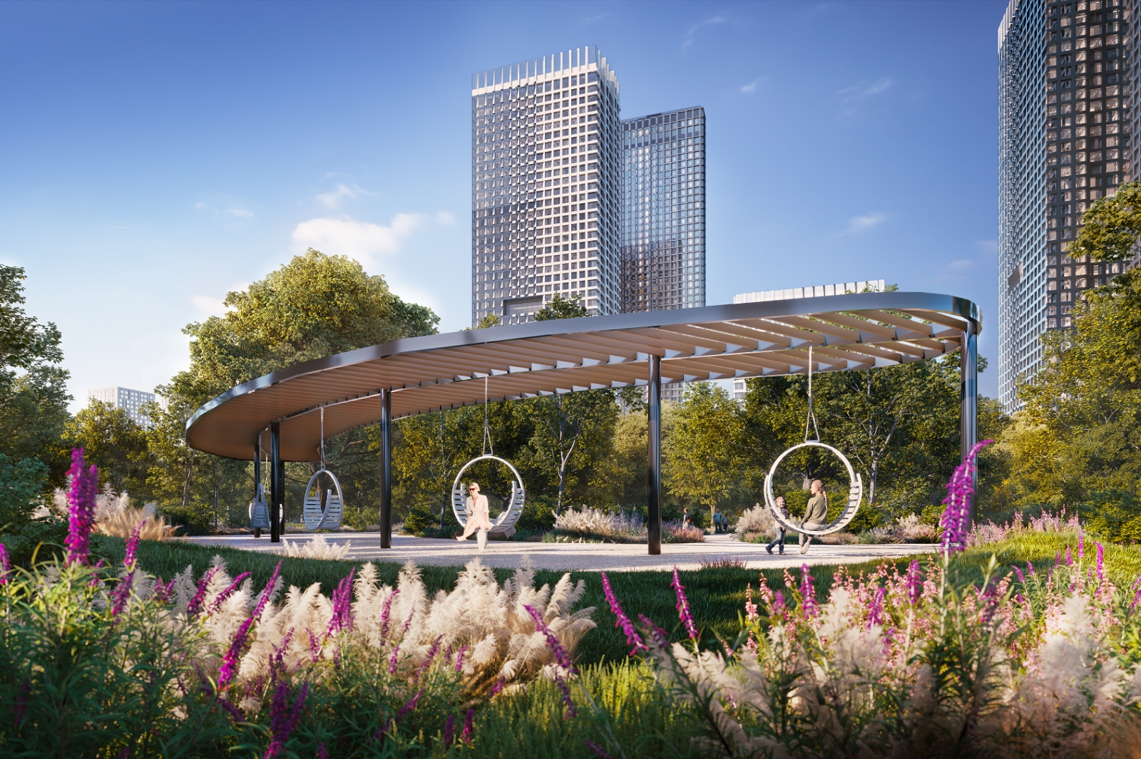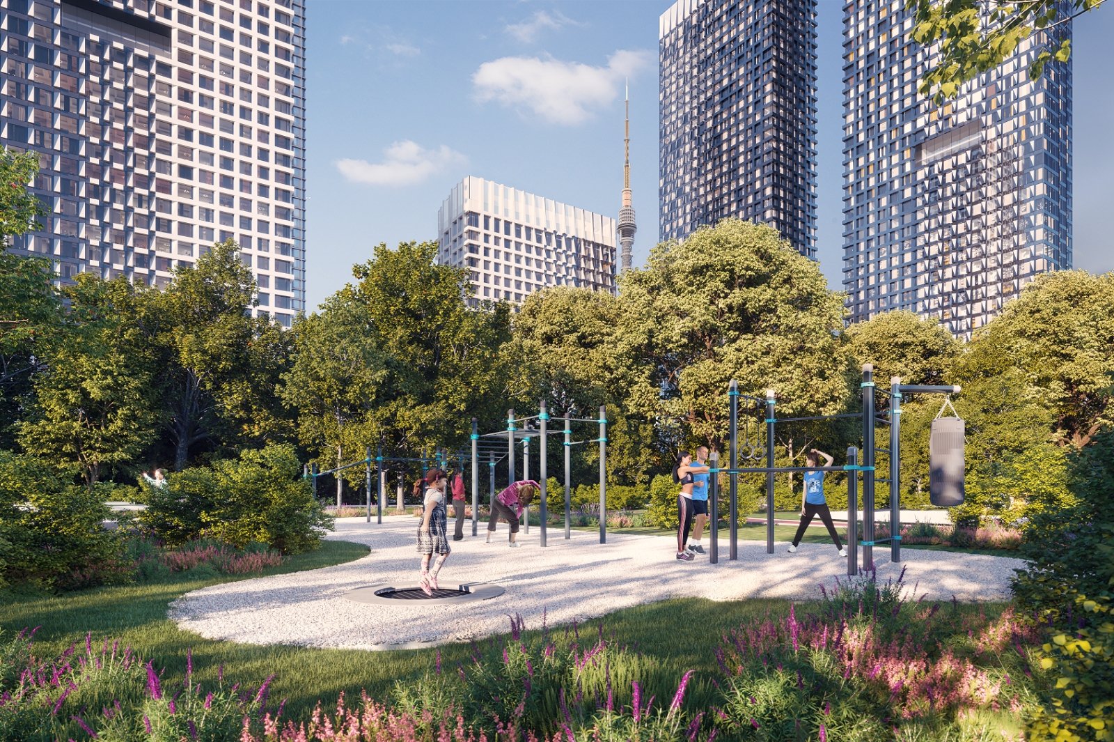 Последователи здорового и активного образа жизни смогут заниматься спортом не только на площадке work-out. Такую возможность предполагают и полуоткрытые лужайки парка. А зонирование пространства, приватность и защищенность обеспечит ландшафтная геопластика рельефа за счет создания естественных холмов. Используя этот прием, архитекторы возведут природные кулисы, разграничивая территории для активного времяпрепровождения и создавая особые естественные «тихие зоны», где можно отдыхать или заниматься спокойными видами спорта.