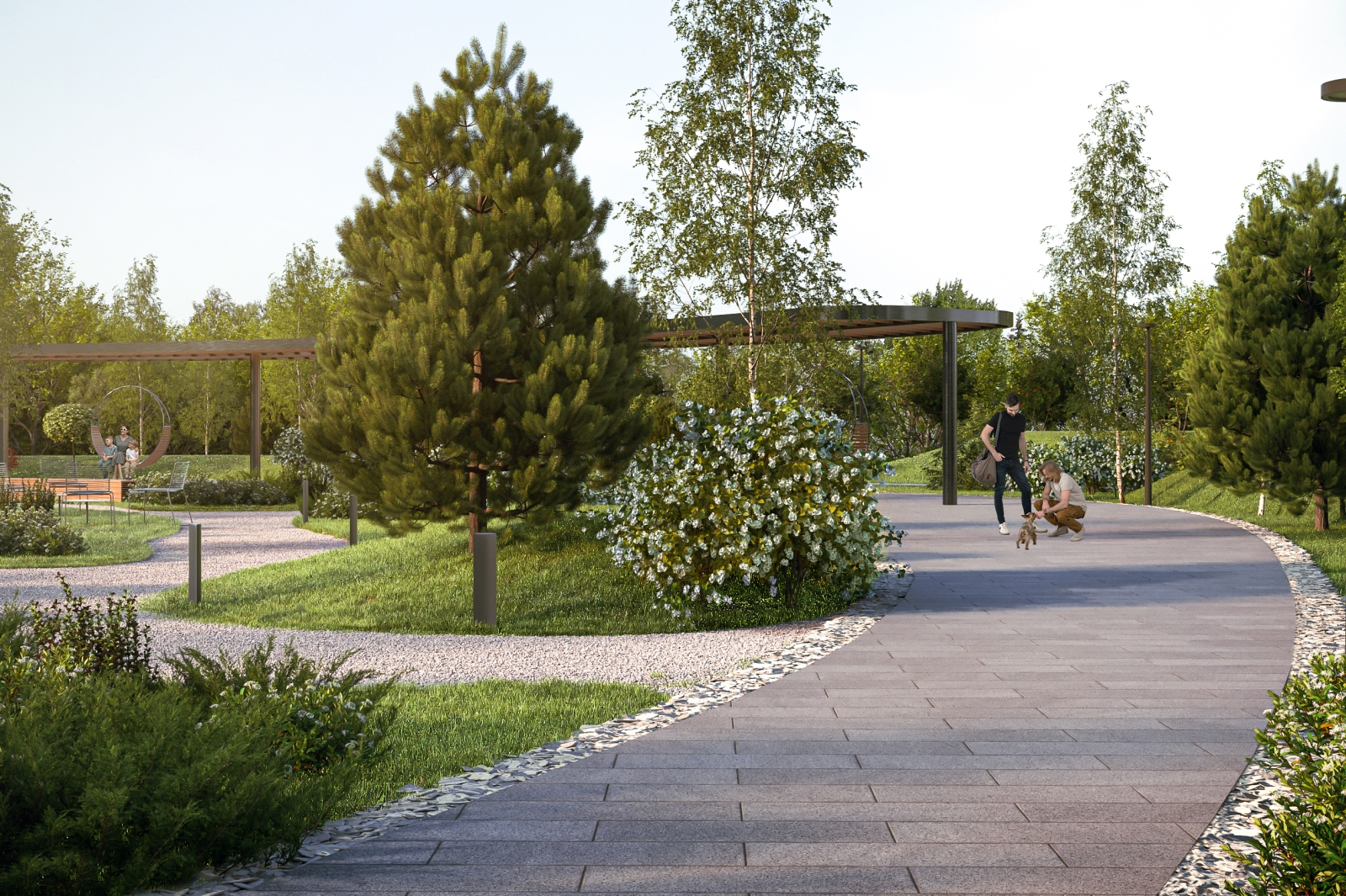 После активных тренировок с домашними питомцами жители смогут отправиться в сенсорный сад на территории ландшафтного парка для медитации или чтения, где предусмотрено зонирование пространства для всестороннего восприятия окружающей экосистемы разными органами чувств. Также там есть экотропы, заполненные кварцевым белым песком и гравием, с безопасным покрытием. Разноуровневое освещение создаст особую атмосферу.