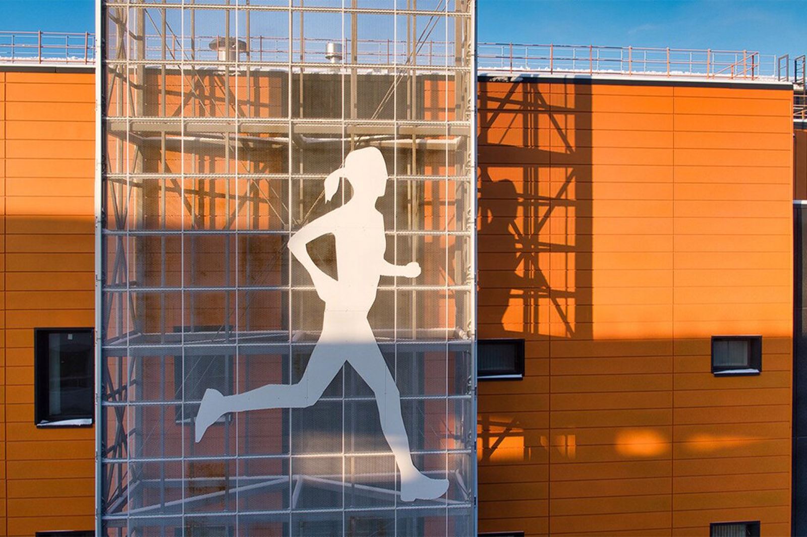 Фасады здания будут дополнены декоративными перфорированными панелями с изображением фигур спортсменов.