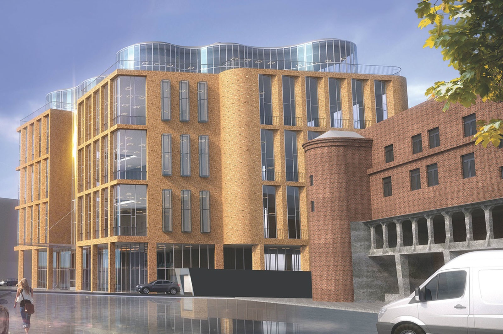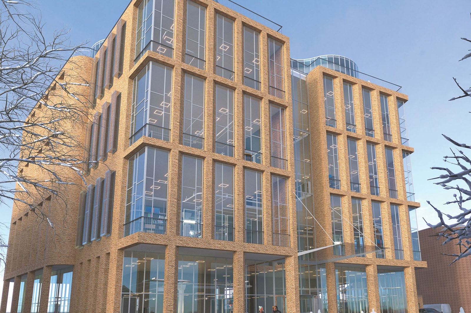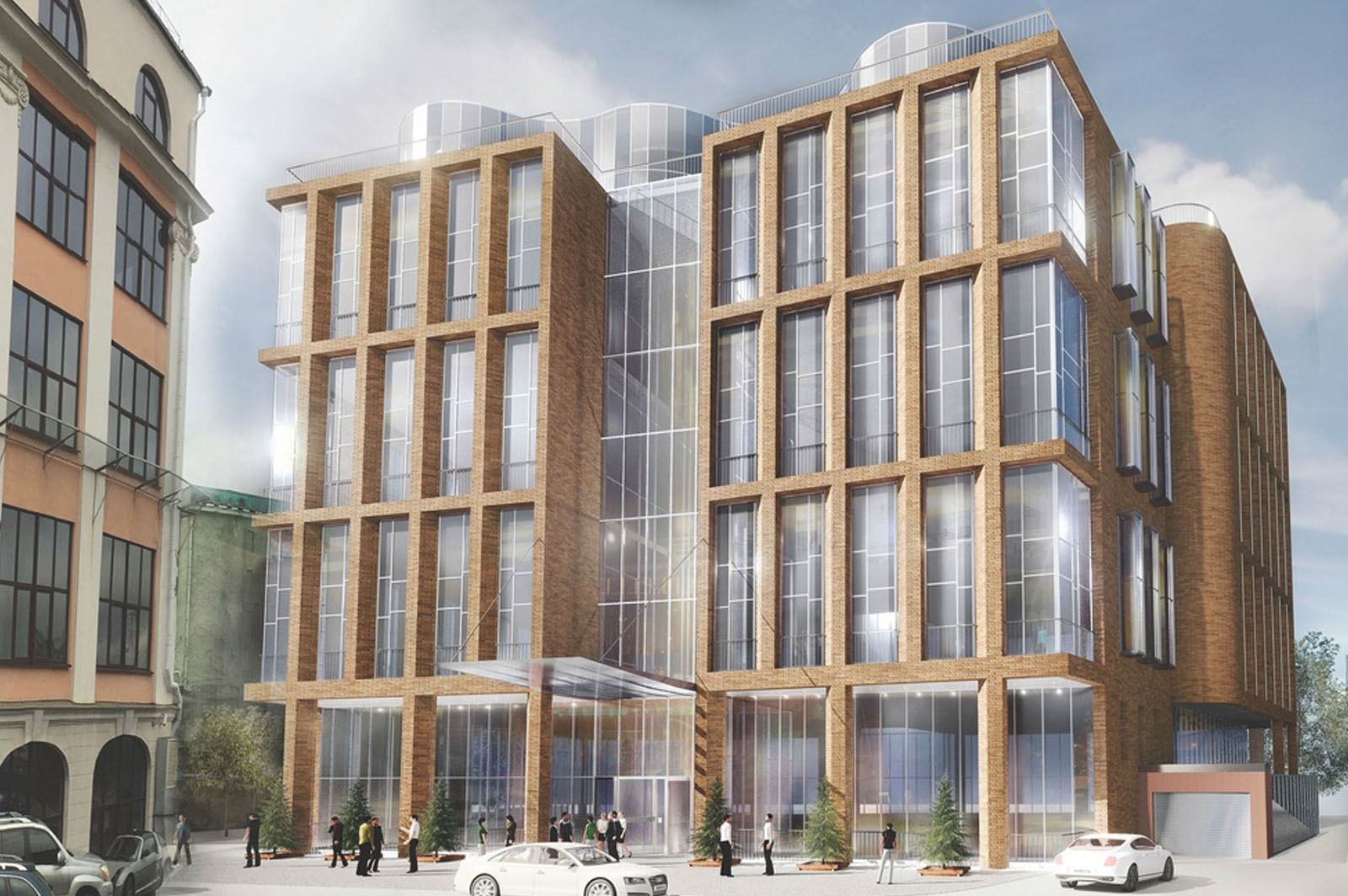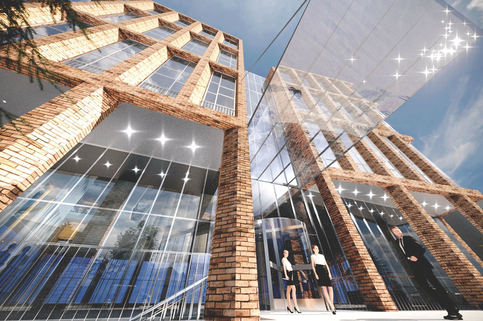 «Для отделки фасада используют клинкерный кирпич и натуральный камень. Здание будет выполнено в виде двух трапециевидных объемов со скругленными углами. Визуально фасады поделены на пять уровней, последний полностью выполнен из стекла, другие частично декорированы кирпичными пилонами в стиле окружающей застройки», – пояснил главный архитектор.