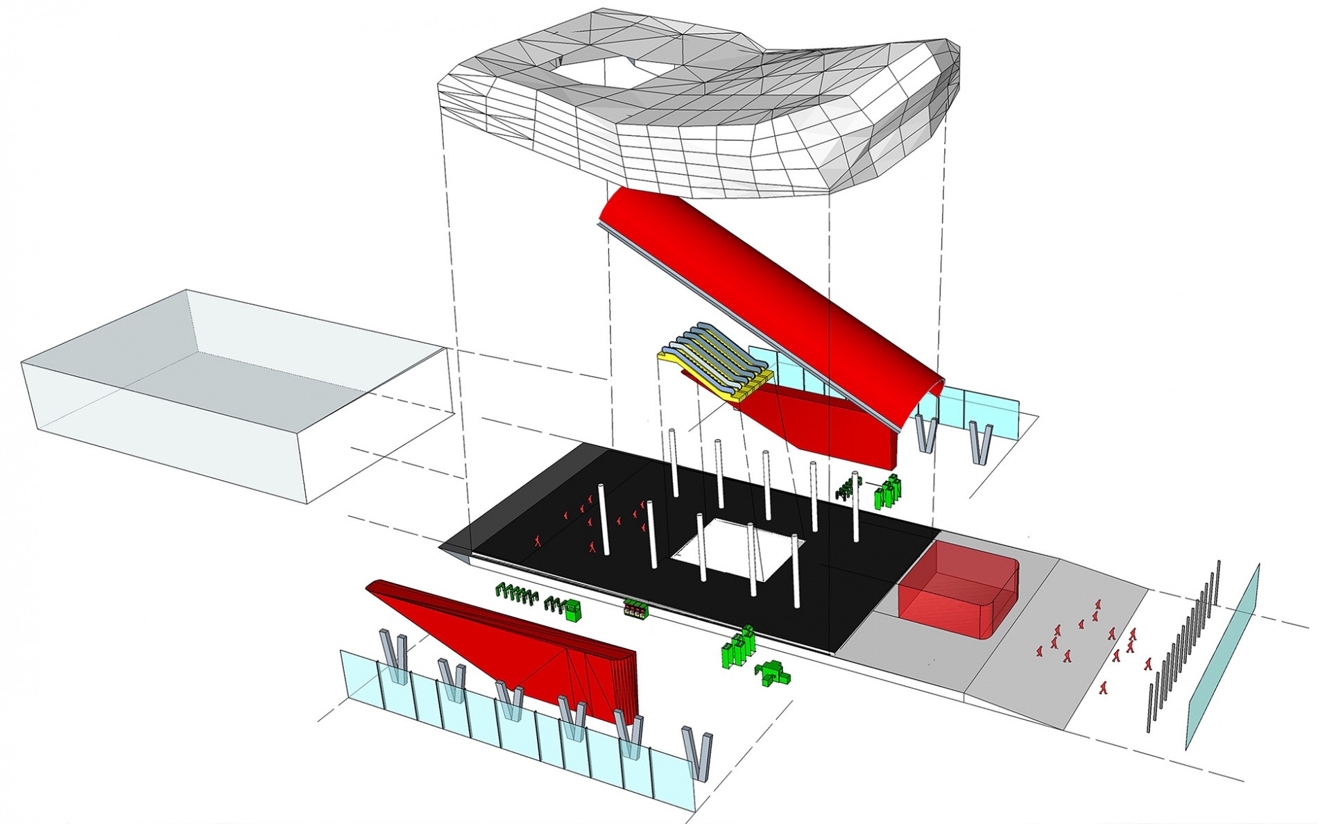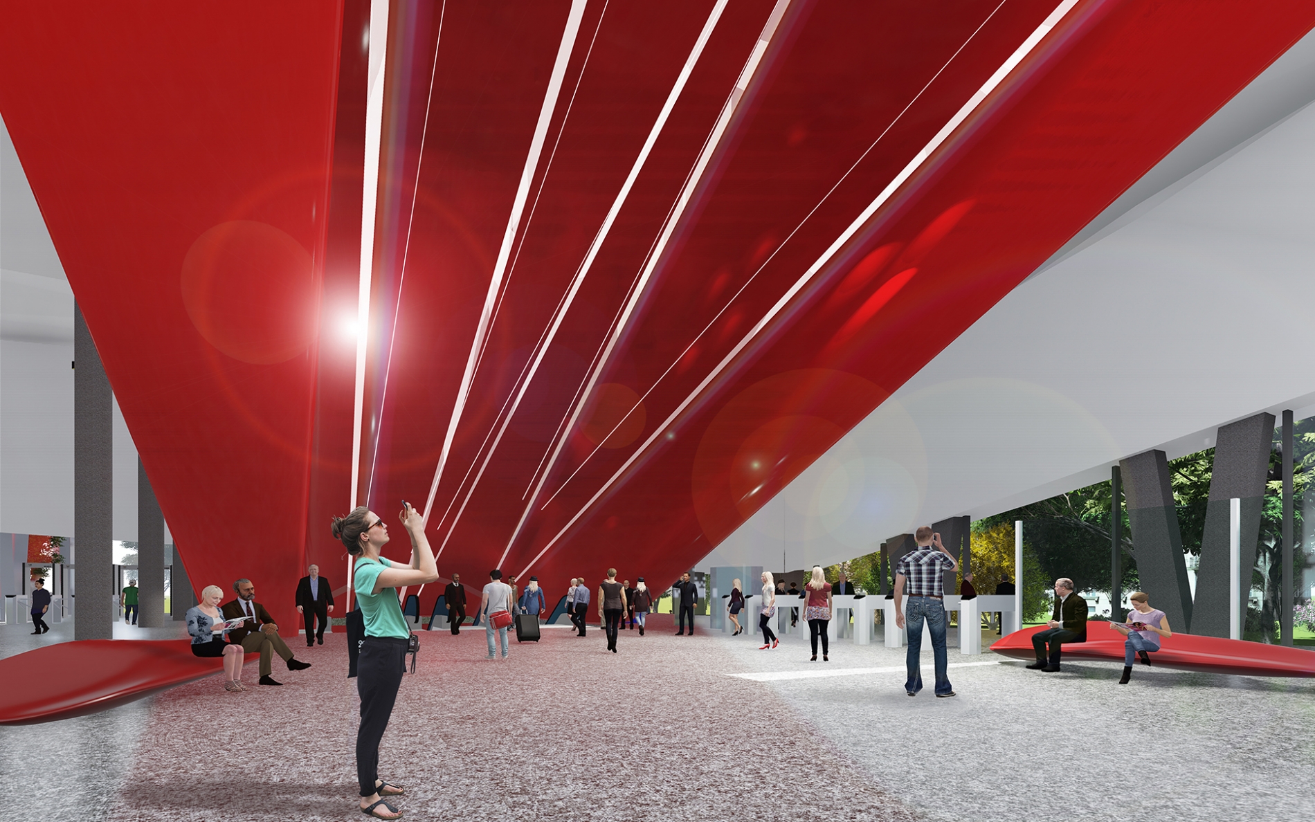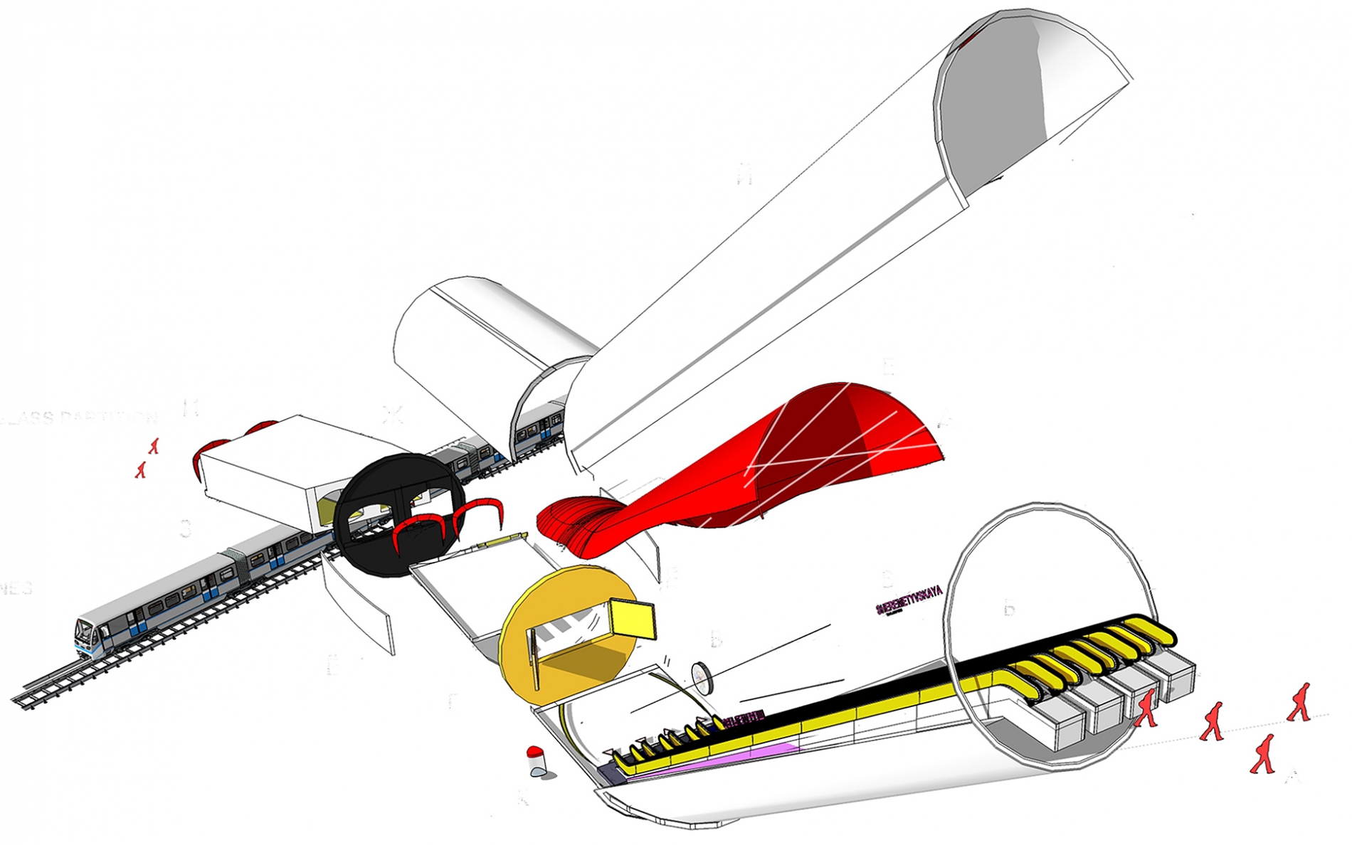 Проект аргентинского консорциума, в который входят бюро Pride и EstudioA3, замыкает тройку финалистов. Его поддержали 11,45 процента участников «Активного гражданина». Архитекторы обыграли тему стремительного движения. Ощущение скорости они передали с помощью потолка красного цвета, который используется во всем интерьере. Символизирует скорость света и дополняет динамичный интерьер продольное потолочное освещение. Проект не оставил равнодушными мужчин и москвичей в возрасте до 24 лет. Затруднились с ответом 12,71 процента, еще 7,14 процента ответили, что выбирать дизайн должны специалисты.