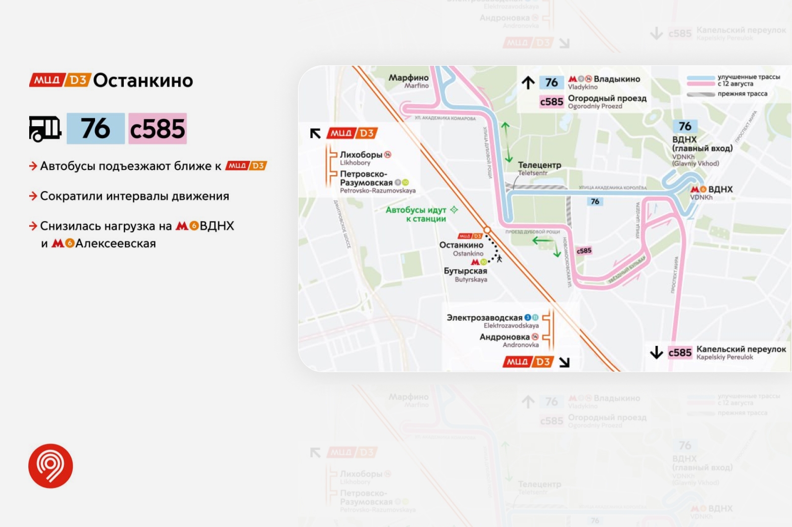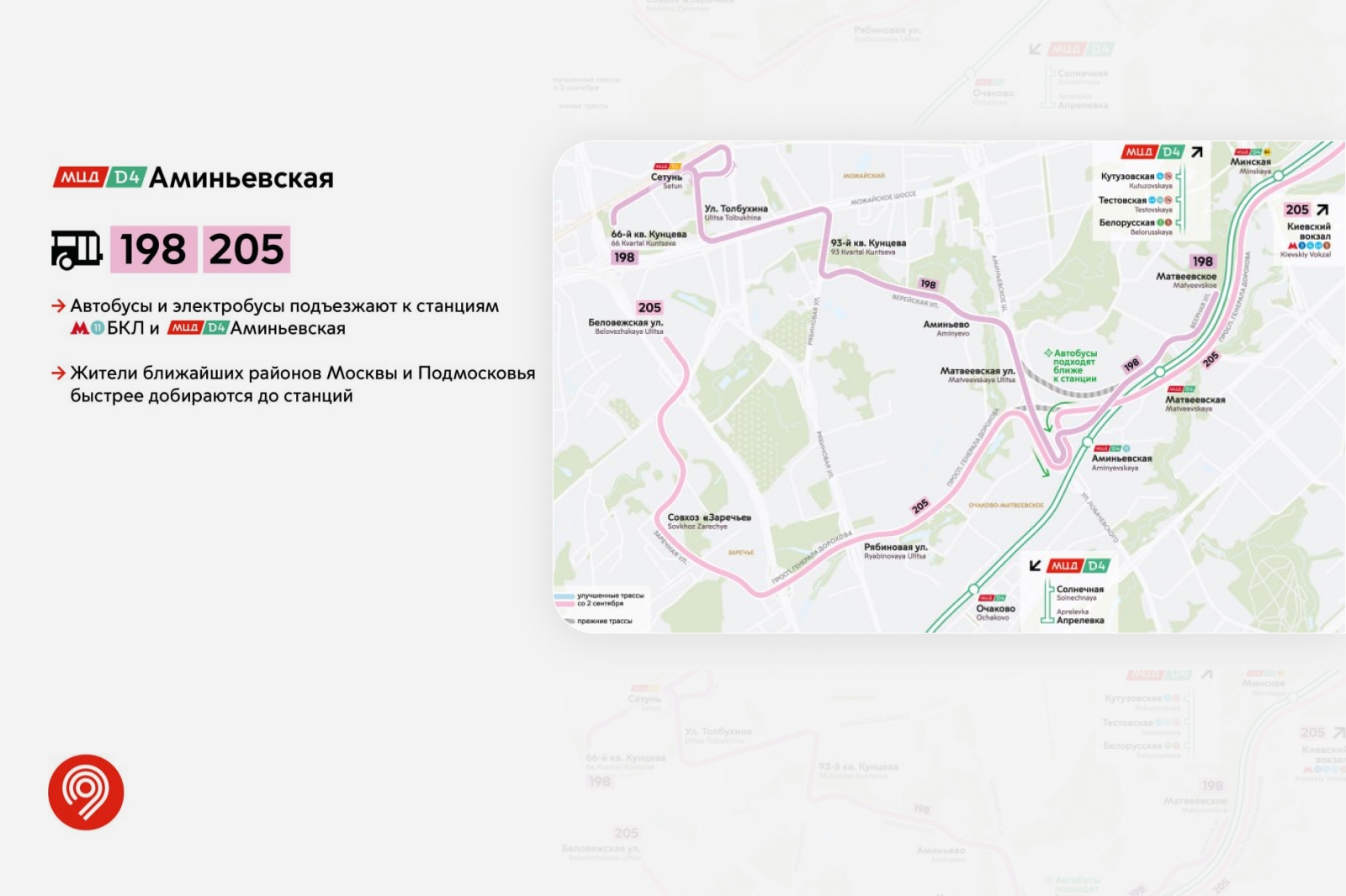 К запуску новых линий наземного метро изменения коснулись маршрутов, которые пролегают возле четырех станций третьего Московского центрального диаметра (МЦД-3) и семи станций МЦД-4. К полному открытию Большой кольцевой линии сделали удобнее 12 маршрутов.