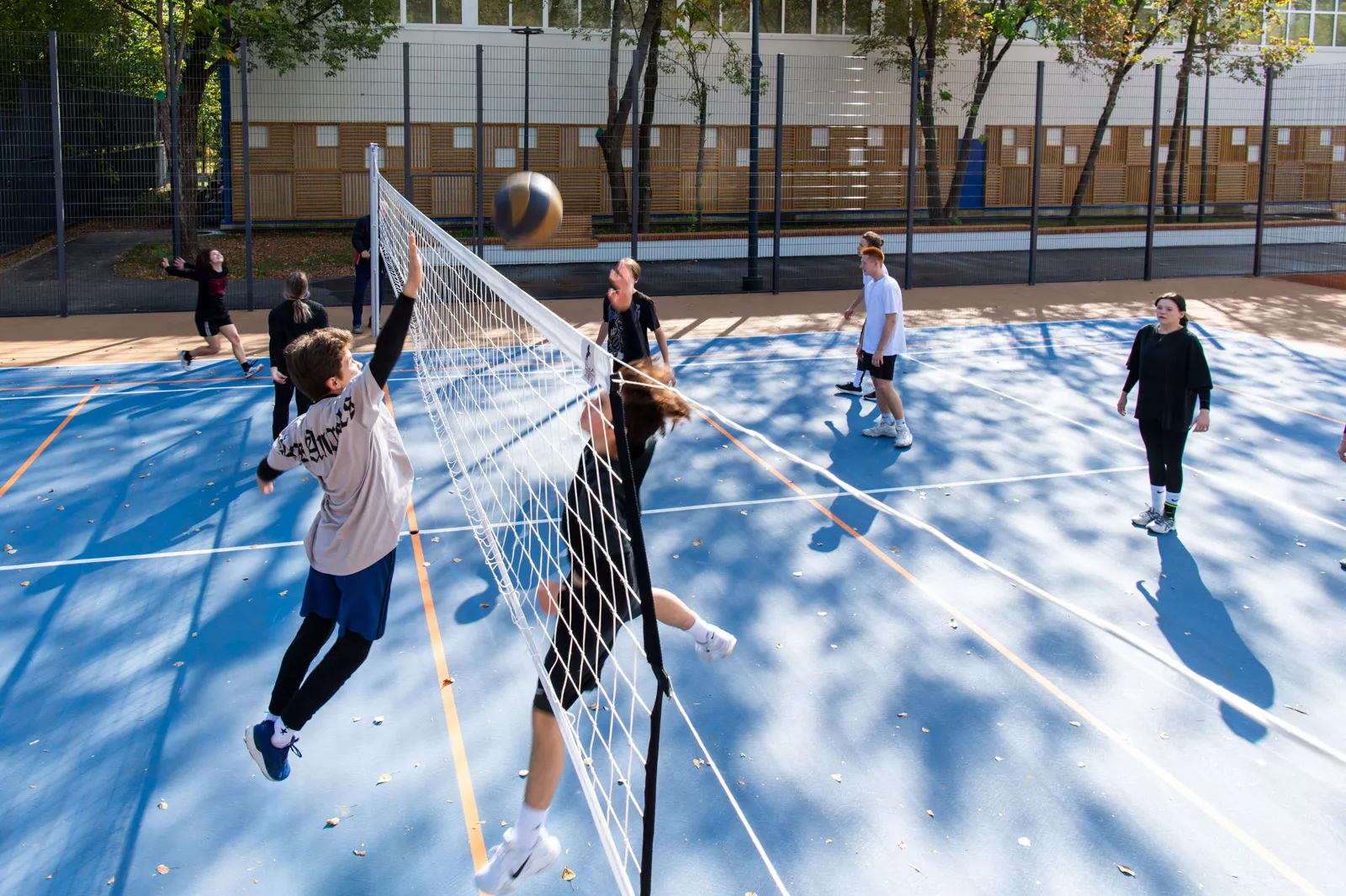 Над зоной силовых тренажеров и настольного тенниса выполнено устройство светопрозрачных навесов, чтобы заниматься спортом было комфортно и в дождливую погоду. Старое покрытие спортивных площадок для игры в волейбол, бадминтон, теннис, стритбол и городки заменили на каучуковое, грунтовое и хард из акриловых слоев.