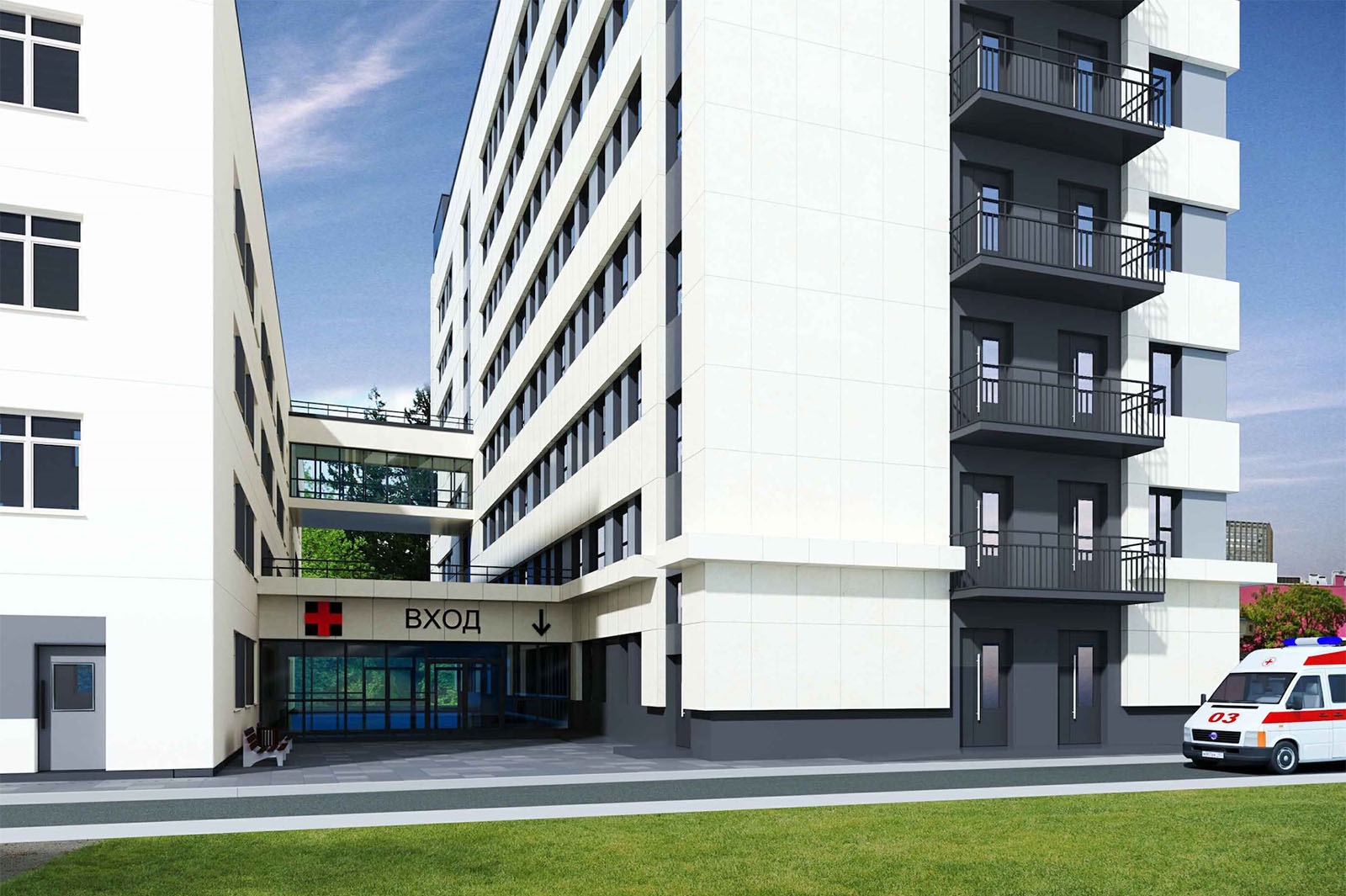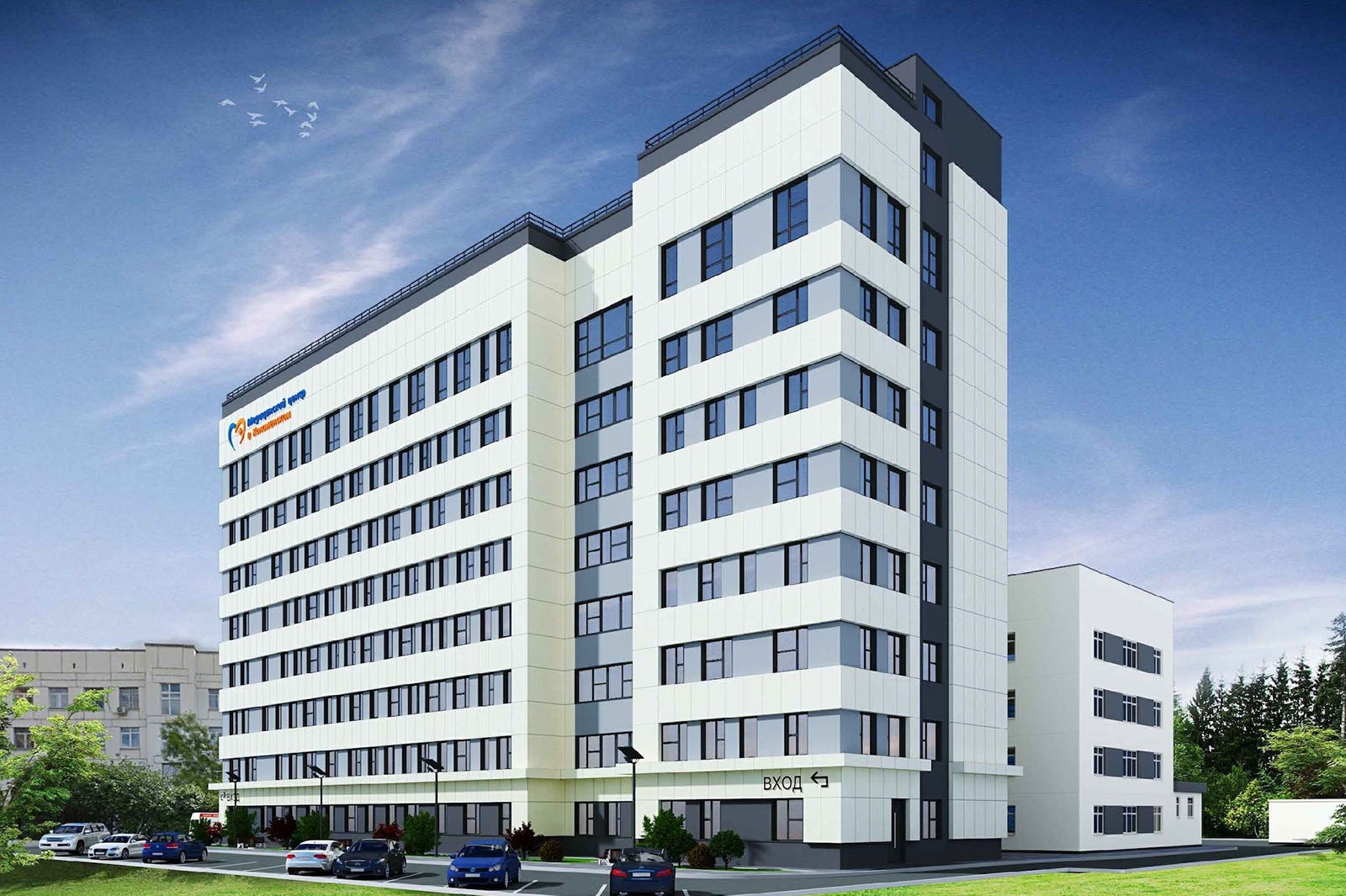 На первом этаже запроектирован вестибюль и переход в уже существующее здание центра. Помимо этого, предусмотрены приемные кабинеты, палаты, отделение реанимации и операционный блок.