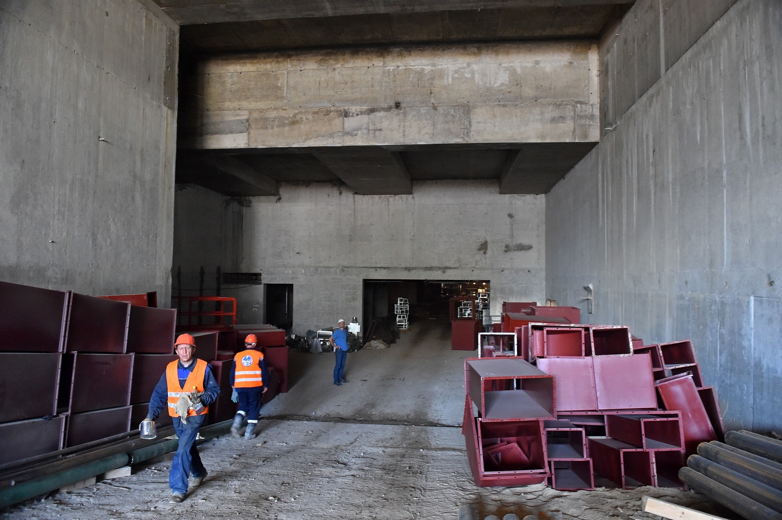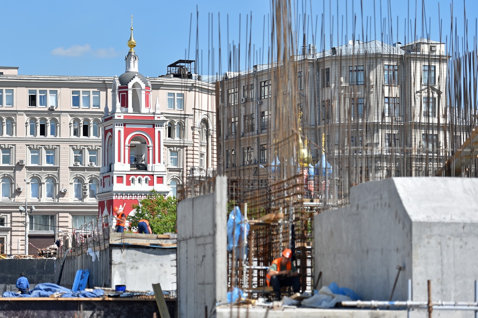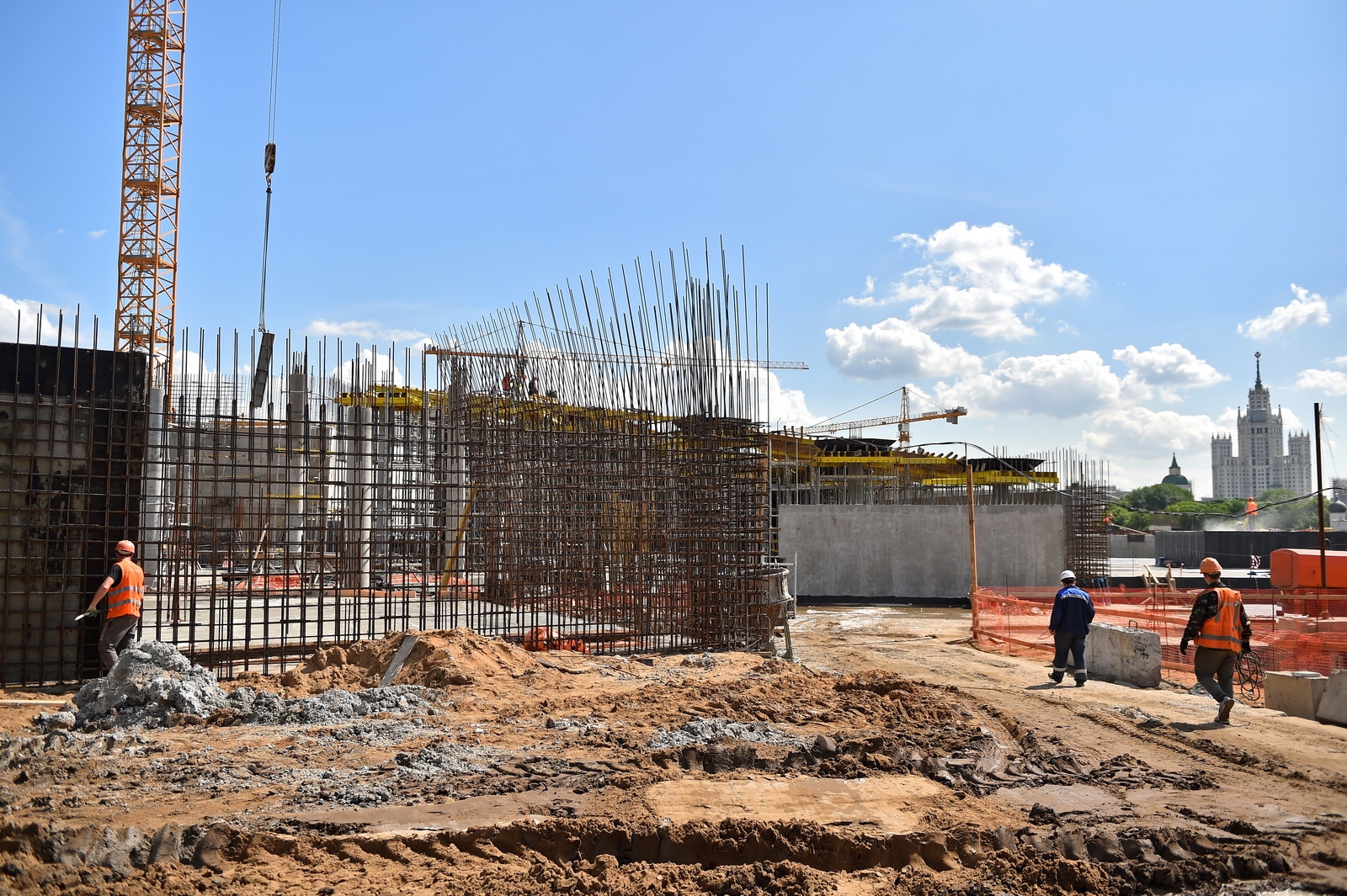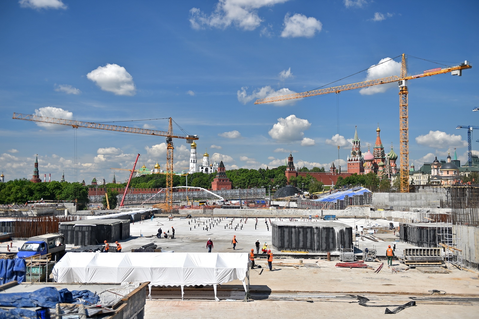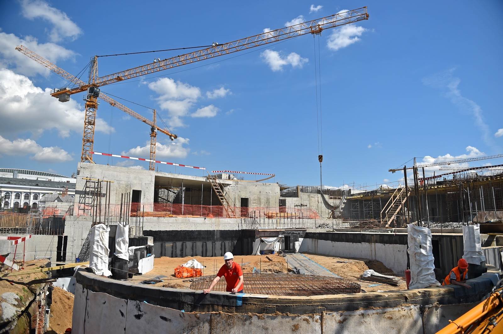 Сейчас в «Зарядье» наряду с медиа-центром, ледяной пещерой и заповедным посольством, строят также филармонию и подземный паркинг. Уже готовы подземные конструкции и основания зданий. Рабочие проводят инженерные коммуникации, возводят стены, колонны и перекрытия этих объектов.