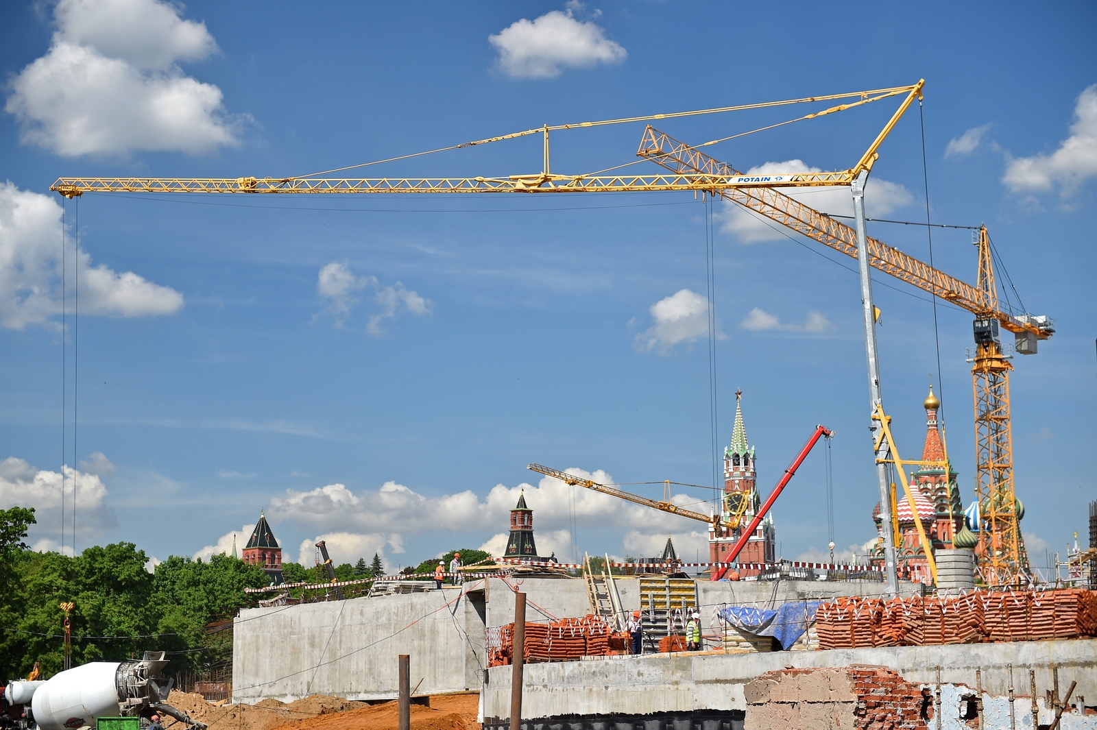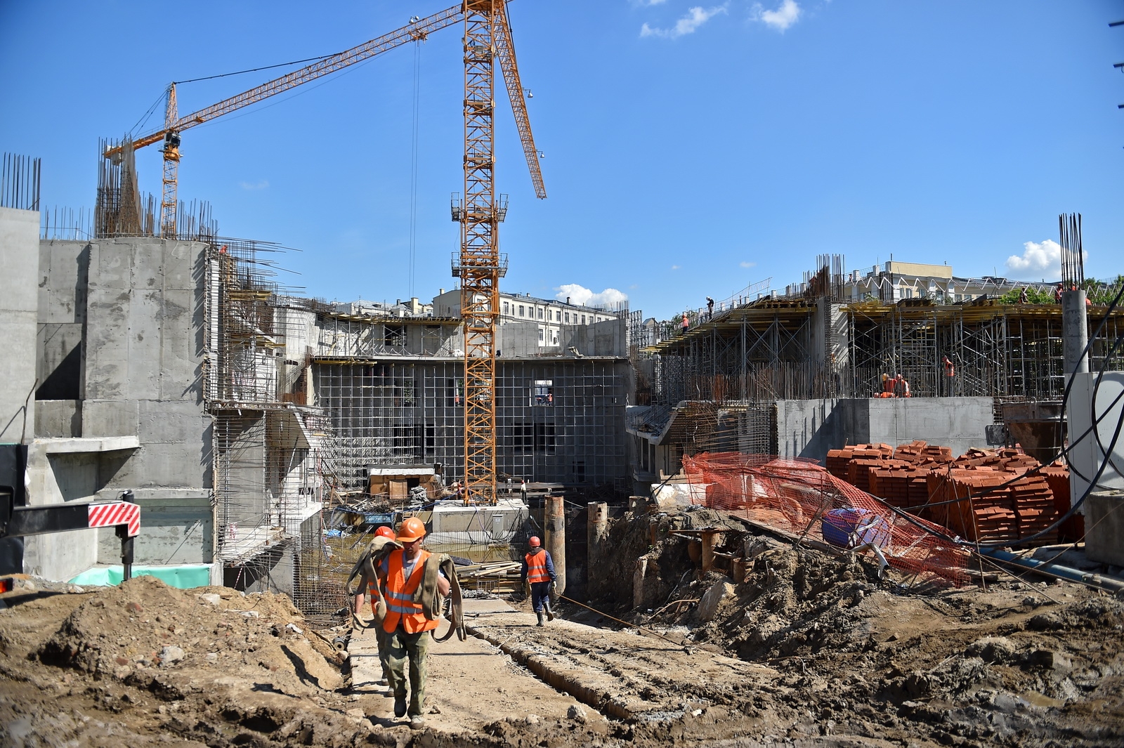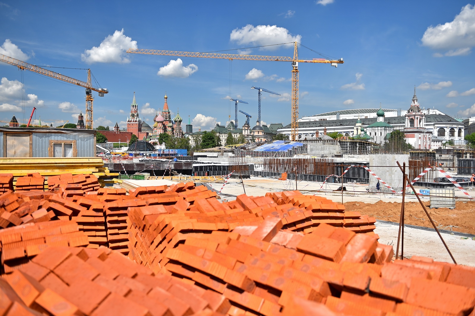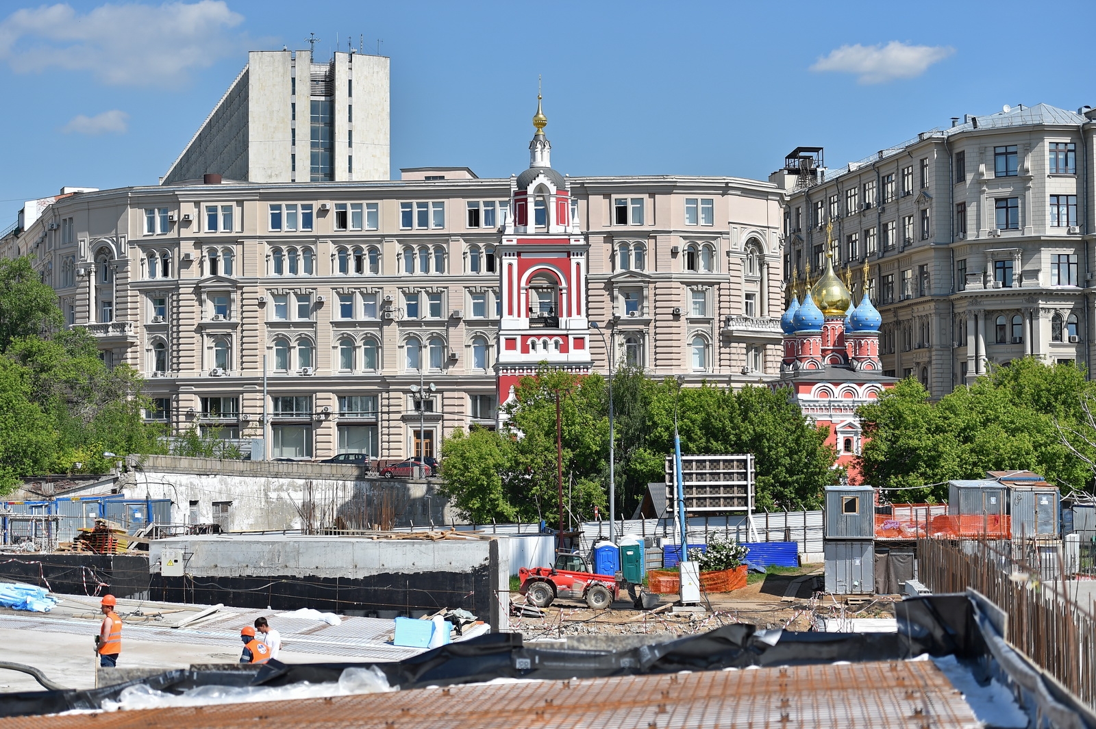 Сейчас в «Зарядье» наряду с медиа-центром, ледяной пещерой и заповедным посольством, строят также филармонию и подземный паркинг. Уже готовы подземные конструкции и основания зданий. Рабочие проводят инженерные коммуникации, возводят стены, колонны и перекрытия этих объектов.