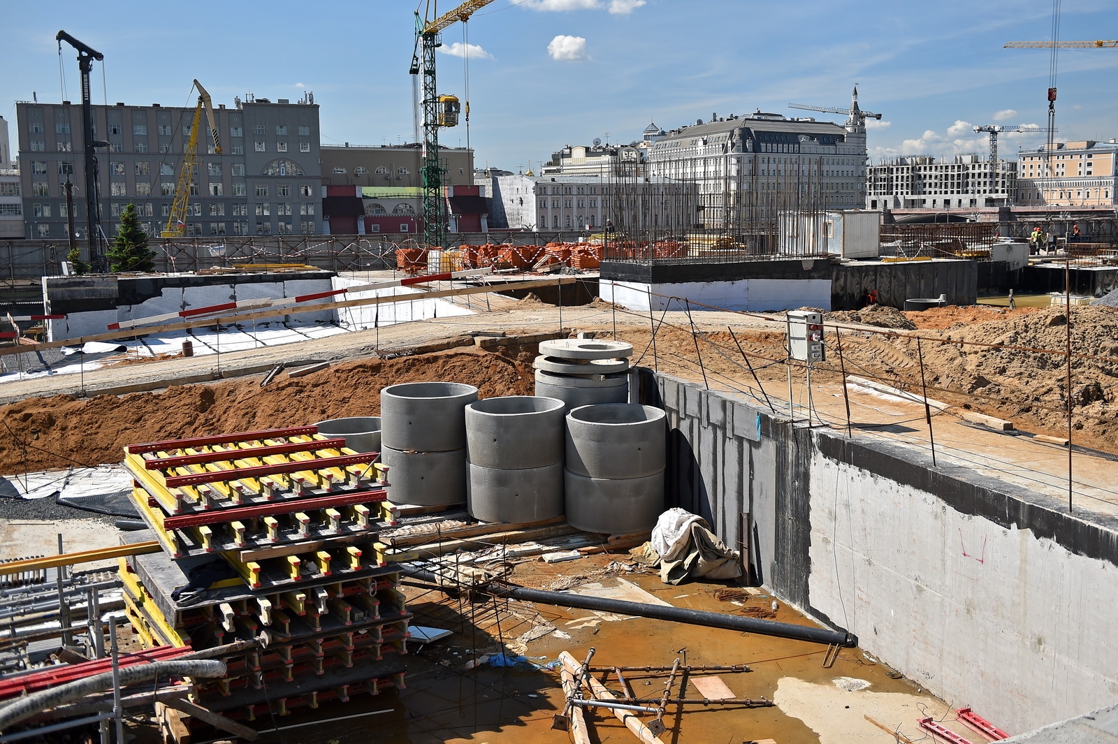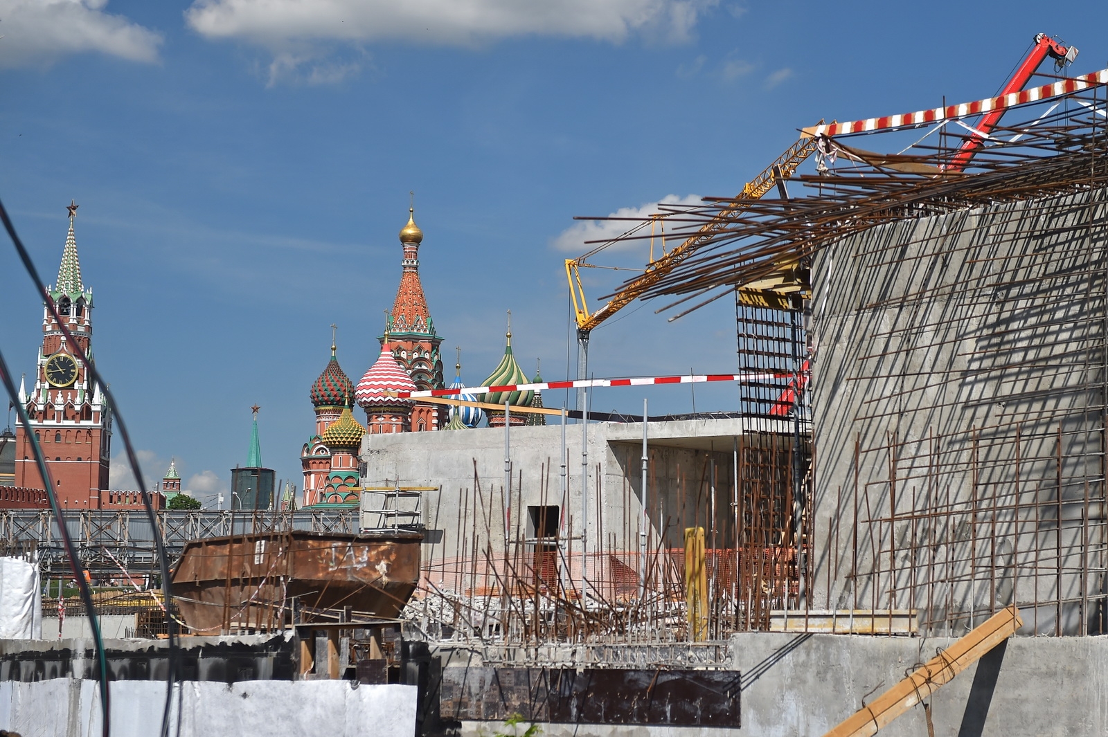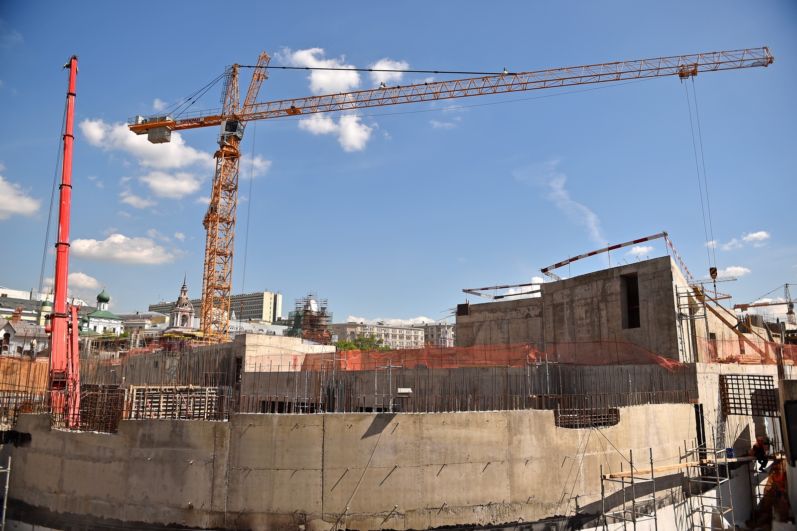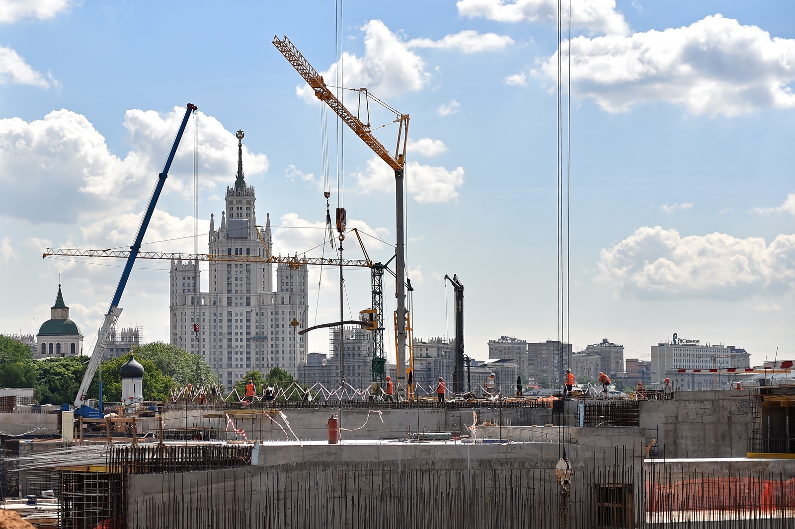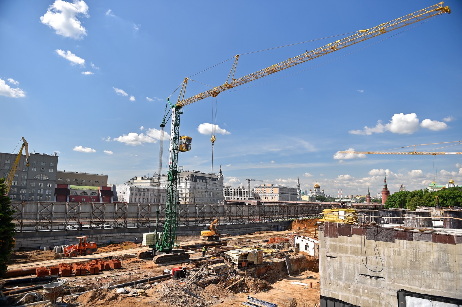 Сейчас в «Зарядье» наряду с медиа-центром, ледяной пещерой и заповедным посольством, строят также филармонию и подземный паркинг. Уже готовы подземные конструкции и основания зданий. Рабочие проводят инженерные коммуникации, возводят стены, колонны и перекрытия этих объектов.
