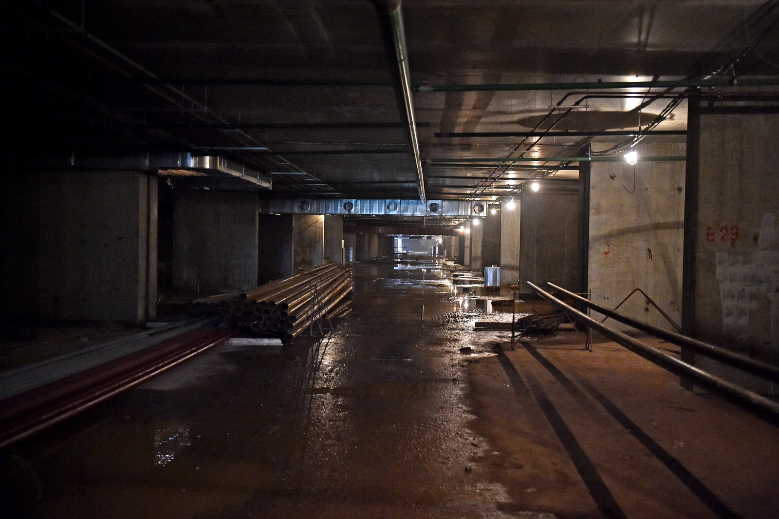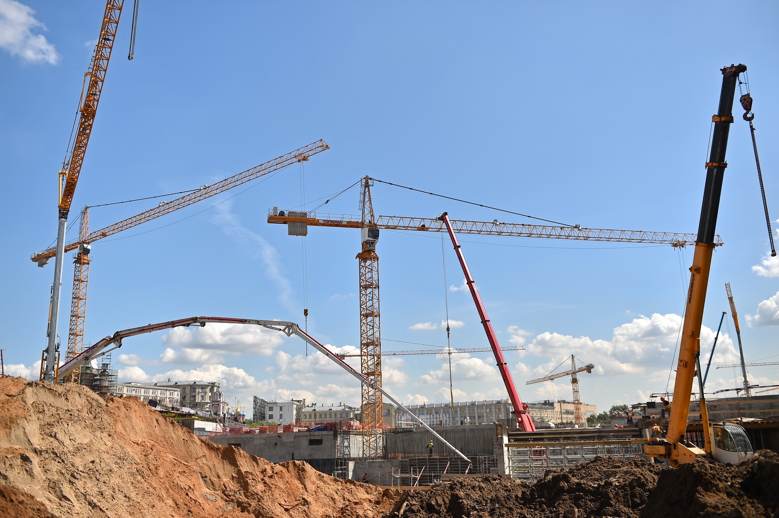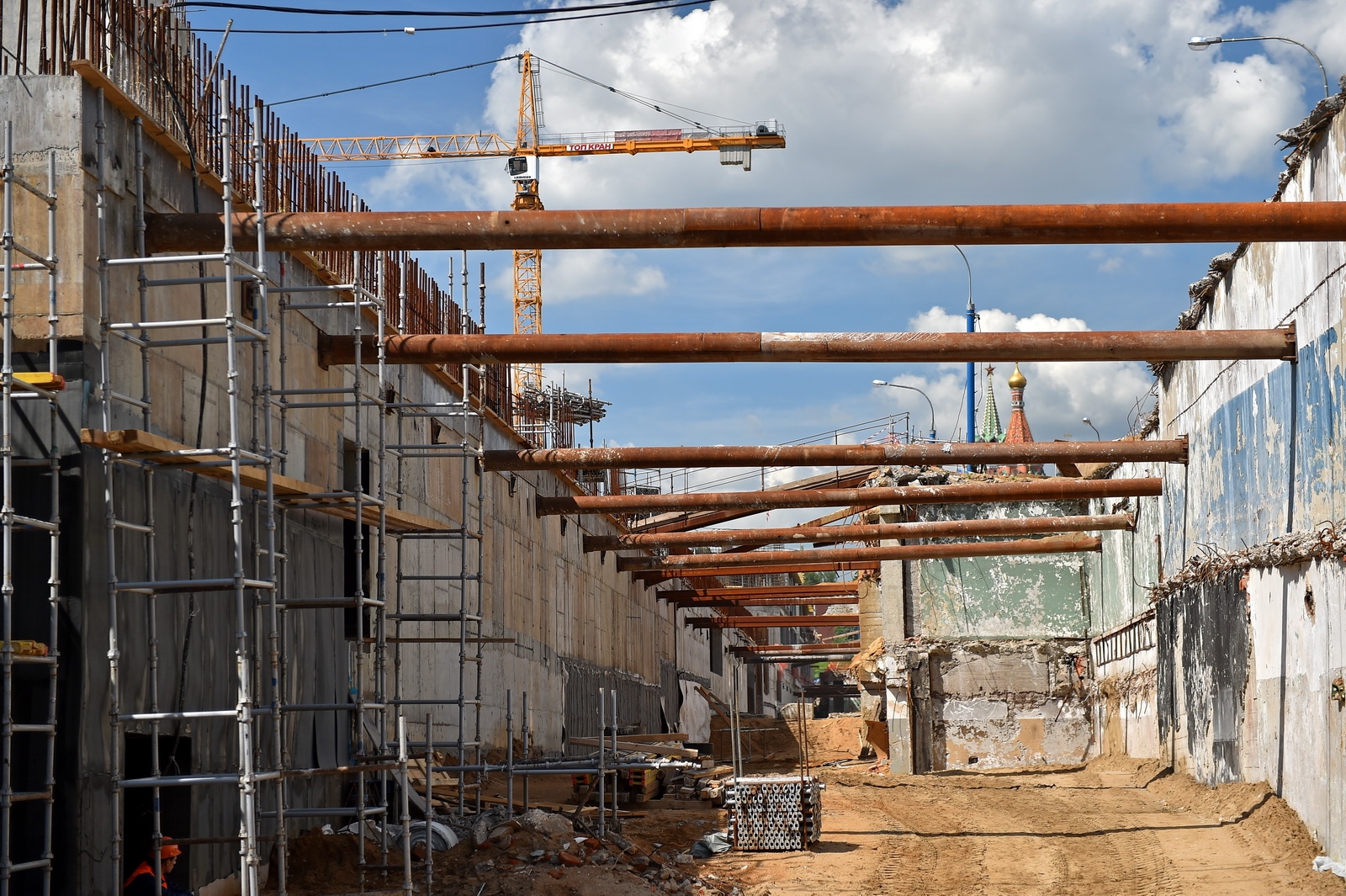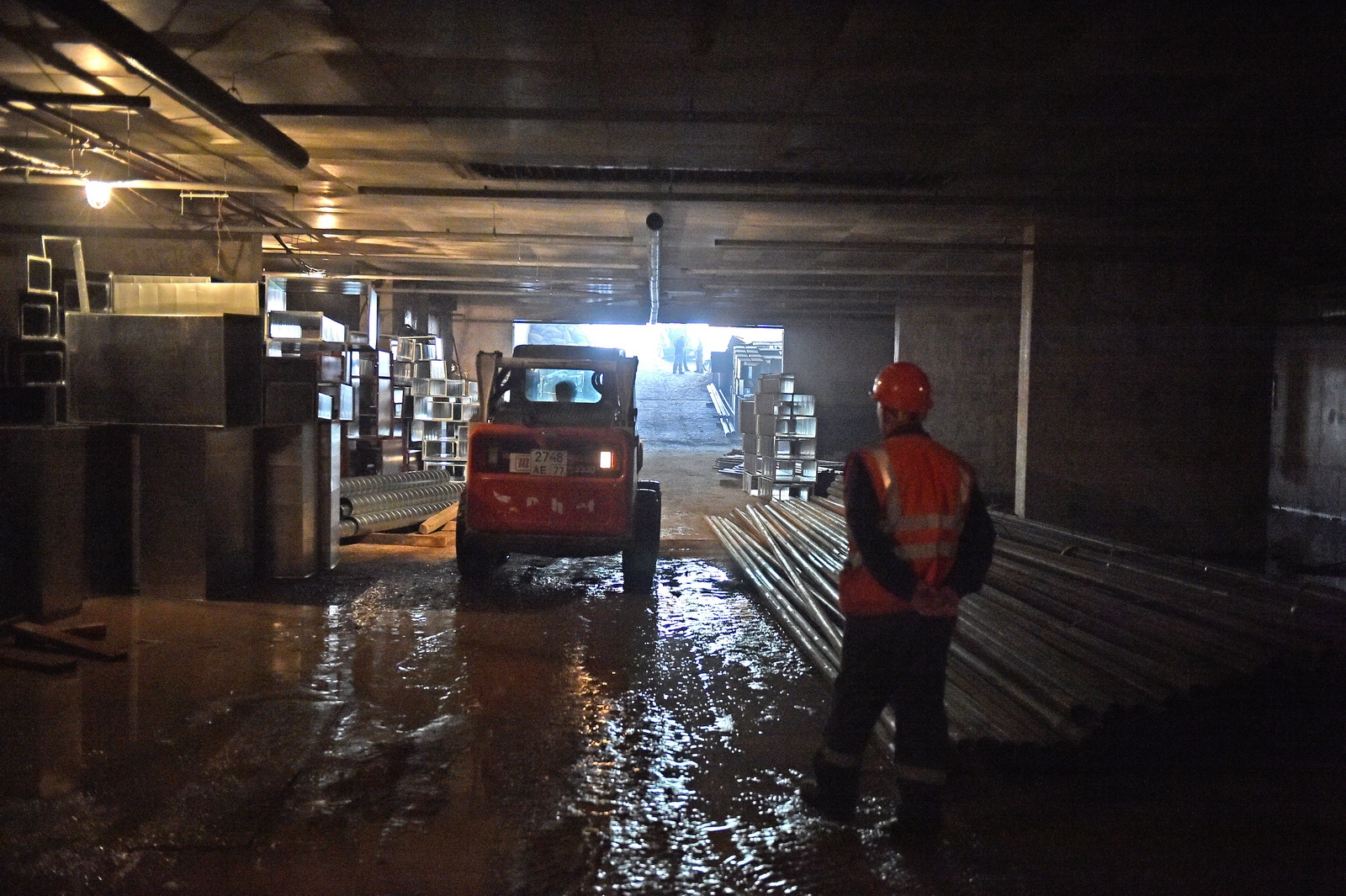Сейчас в «Зарядье» наряду с медиа-центром, ледяной пещерой и заповедным посольством, строят также филармонию и подземный паркинг. Уже готовы подземные конструкции и основания зданий. Рабочие проводят инженерные коммуникации, возводят стены, колонны и перекрытия этих объектов.