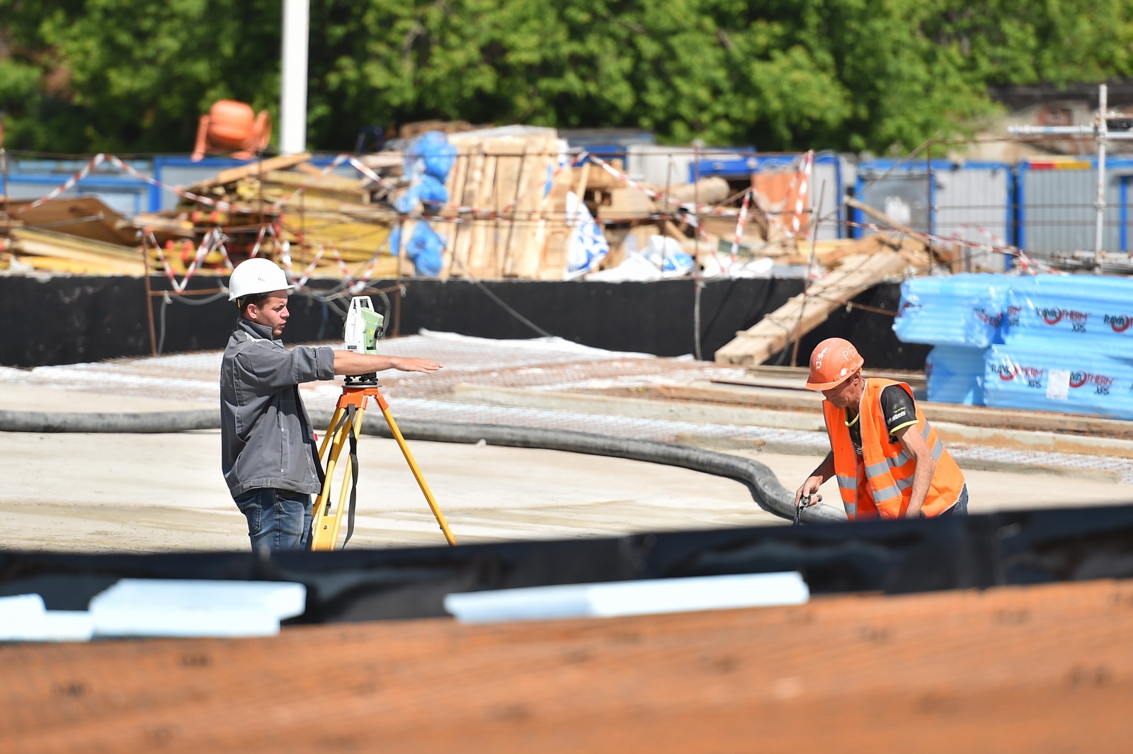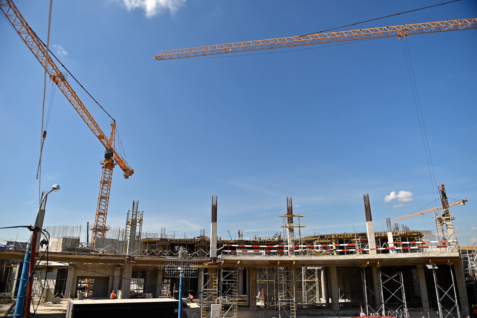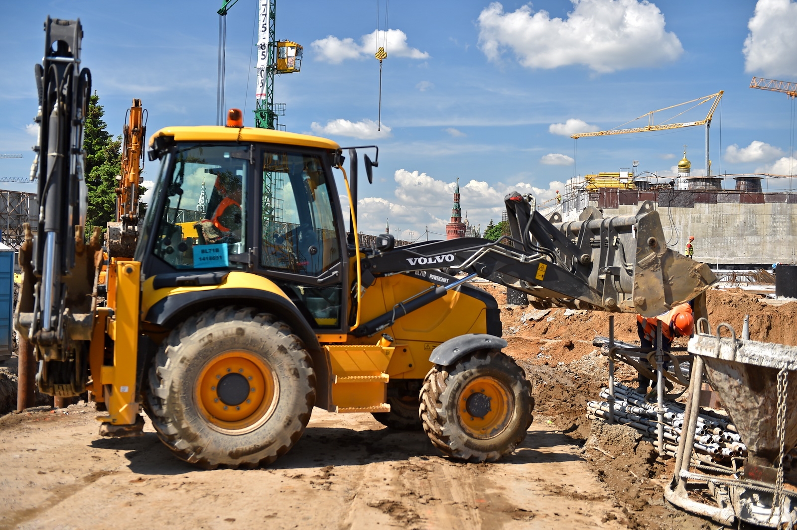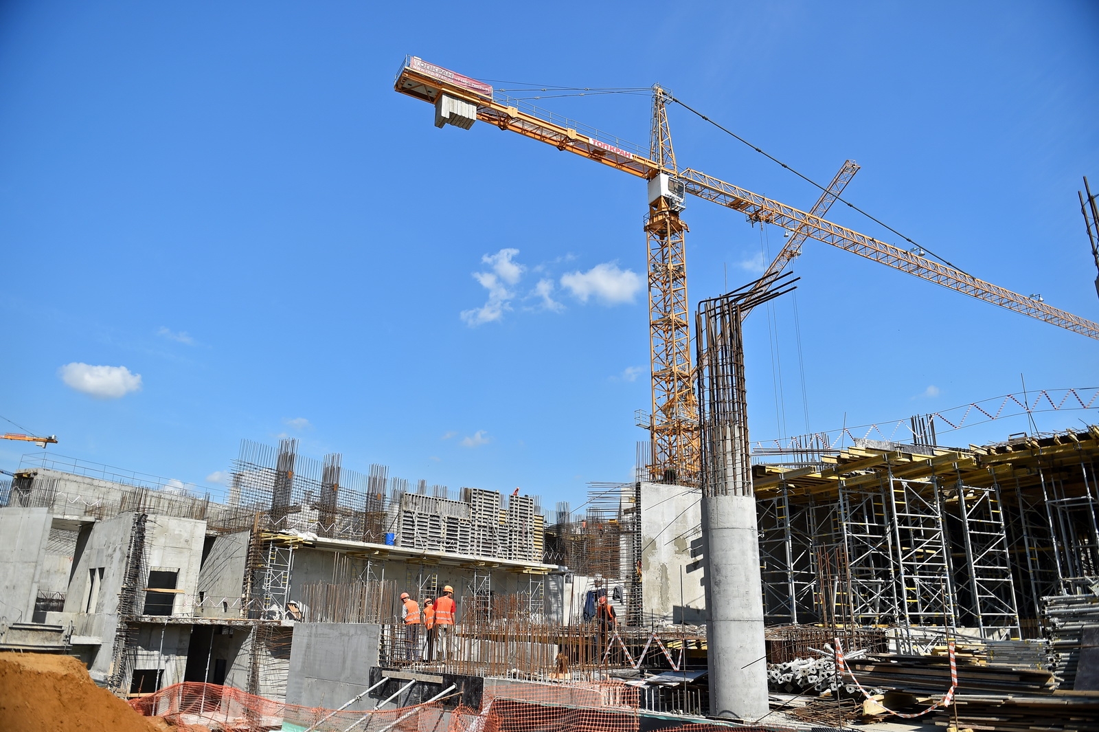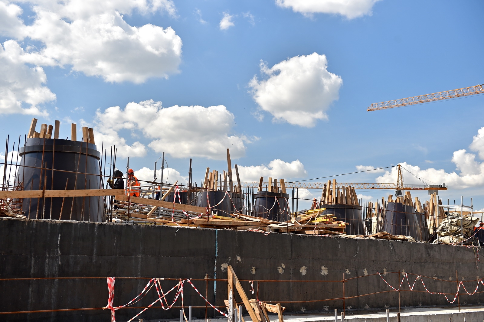 Сейчас в «Зарядье» наряду с медиа-центром, ледяной пещерой и заповедным посольством, строят также филармонию и подземный паркинг. Уже готовы подземные конструкции и основания зданий. Рабочие проводят инженерные коммуникации, возводят стены, колонны и перекрытия этих объектов.