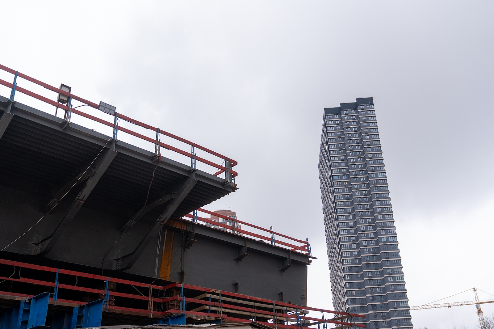 Мэр столицы отметил, что мост возводят методом надвижки, когда многотонную конструкцию двигают мощными домкратами. По проекту также построят и реконструируют 2,1 км дорог, в том числе: