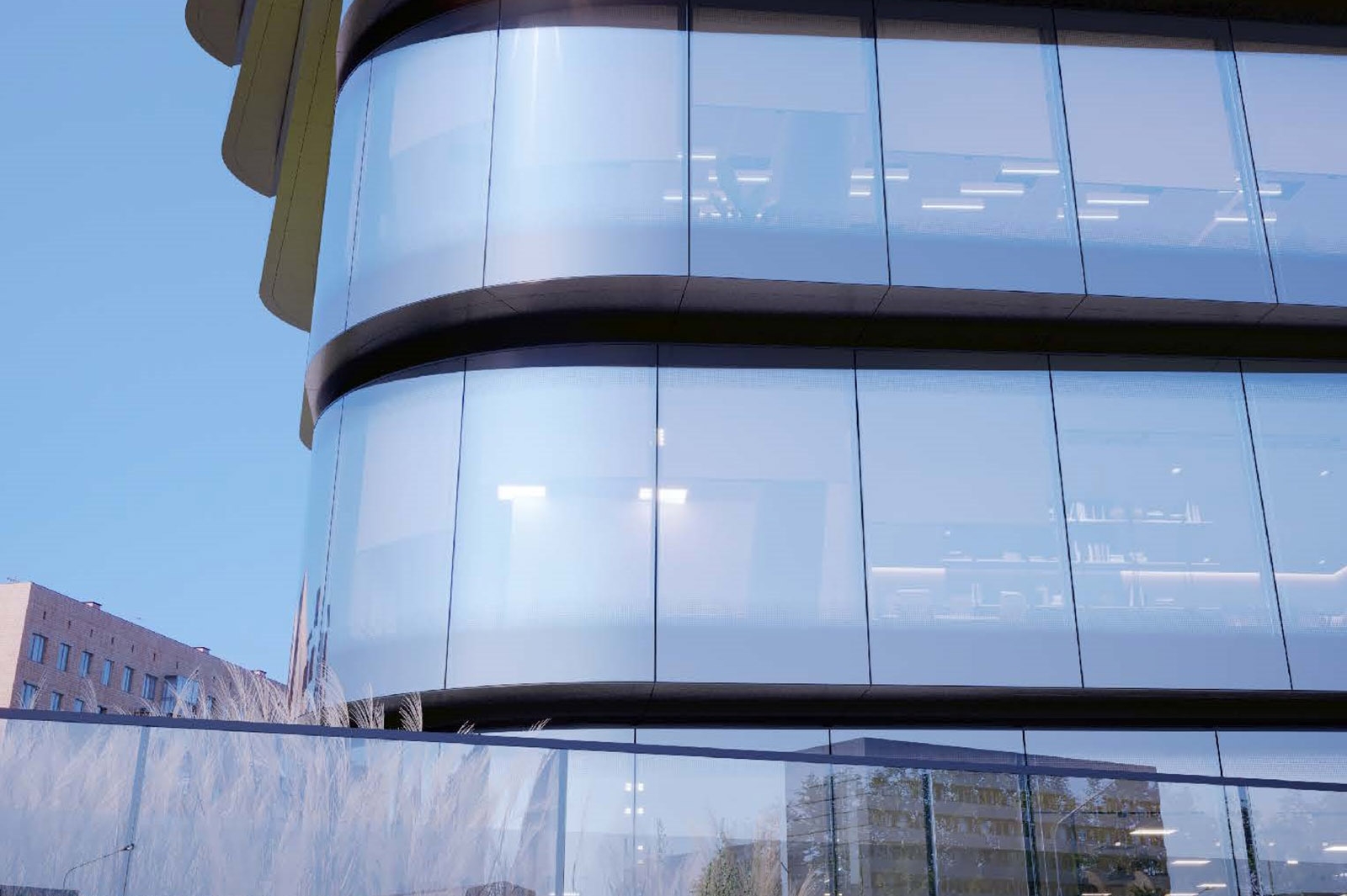 Для отделки используют систему структурного остекления. Она не только подчеркнет форму здания и обеспечит внутреннее пространство дневным освещением, но и позволит вписать объект в городской контекст. Стекло обладает солнцезащитными и энергосберегающими свойствами.
