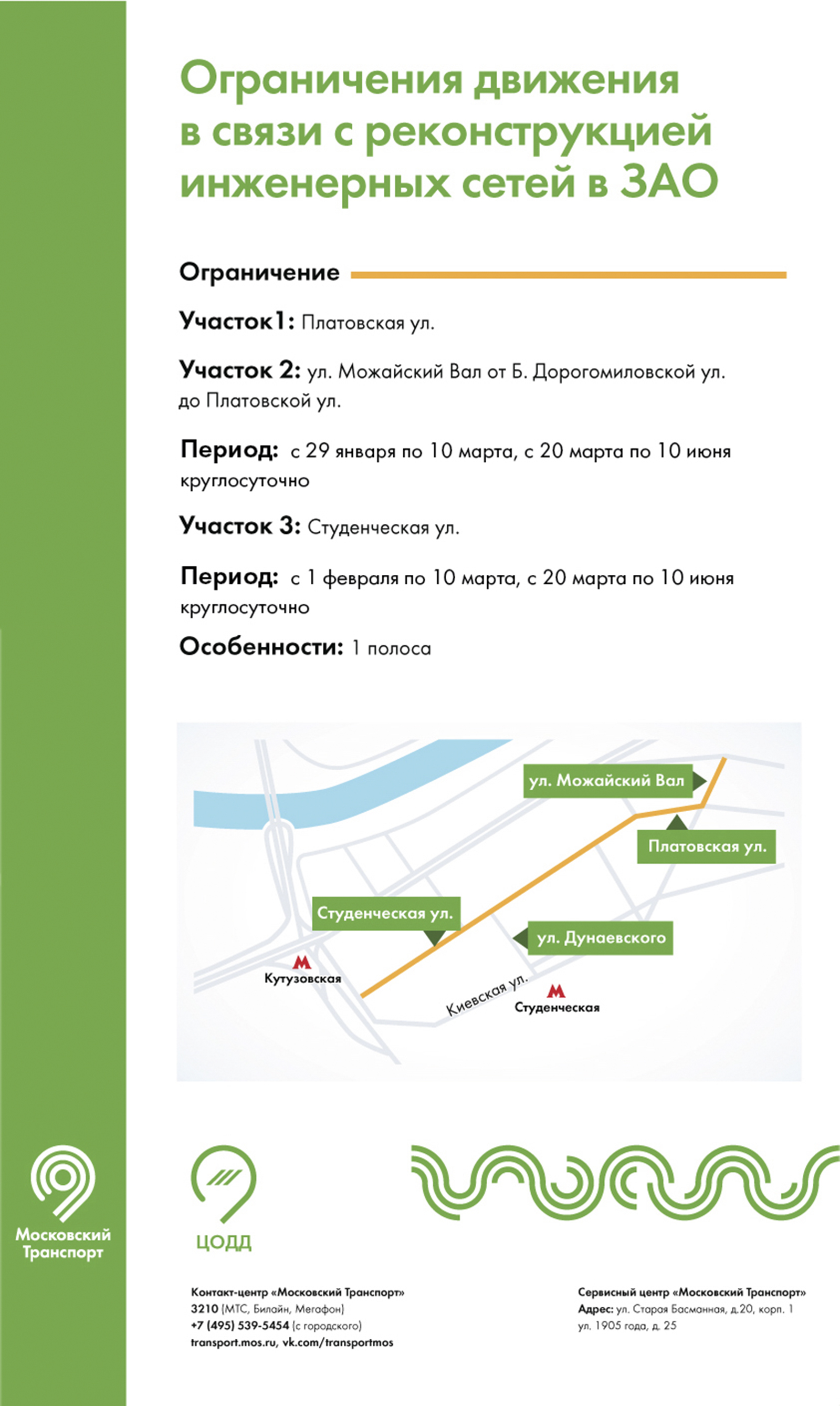 Кроме того, с 1 февраля по 10 марта, а также с 20 марта по 10 июня в районе Дорогомилово будет ограничен проезд по одной полосе Студенческой улицы.