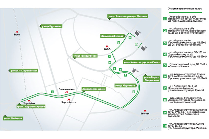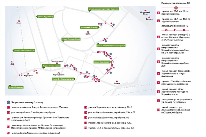 - Ул. Авиаконструктора Микояна от д. 39 с. 3 по Ленинградскому проспекту до Ходынского бульвара;