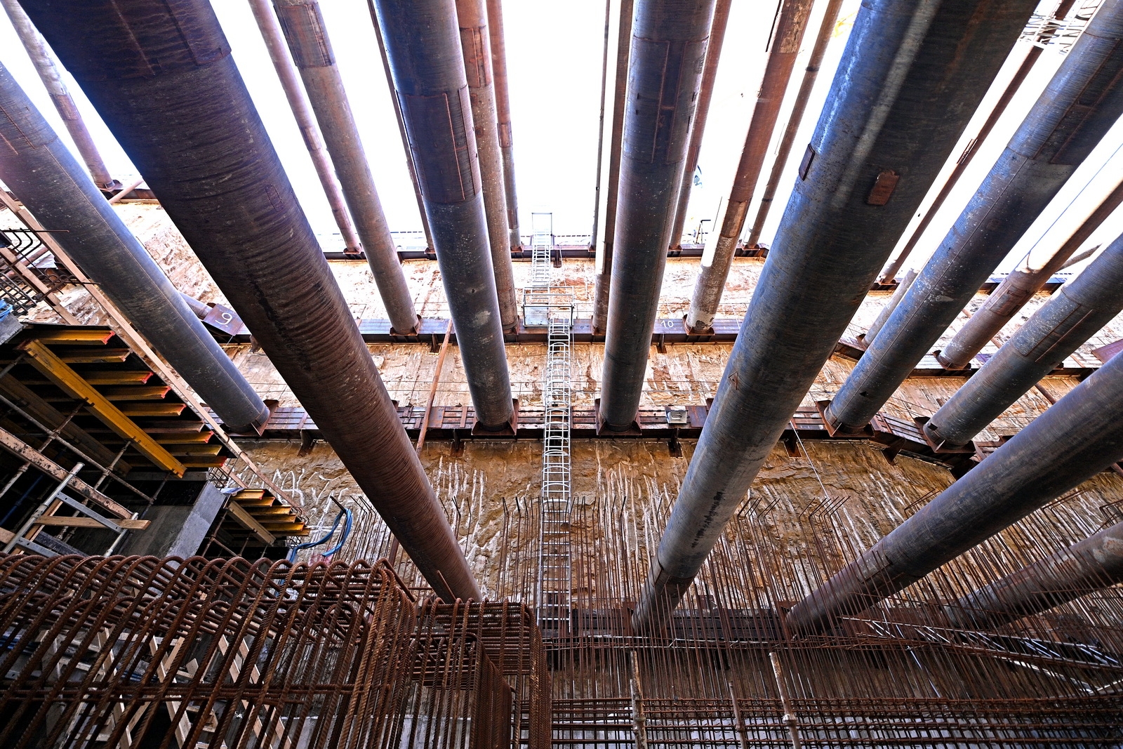 При строительстве станции «Нижегородская» применили технология top-down, когда подземная часть возводится «сверху-вниз» от уровня земной поверхности. Сначала бетонируют перекрытия и сваи-колонны, а потом работы идут вглубь с возможностью параллельного строительства сооружений на поверхности. Это позволяет работать в условиях плотной застройки и экономит время.