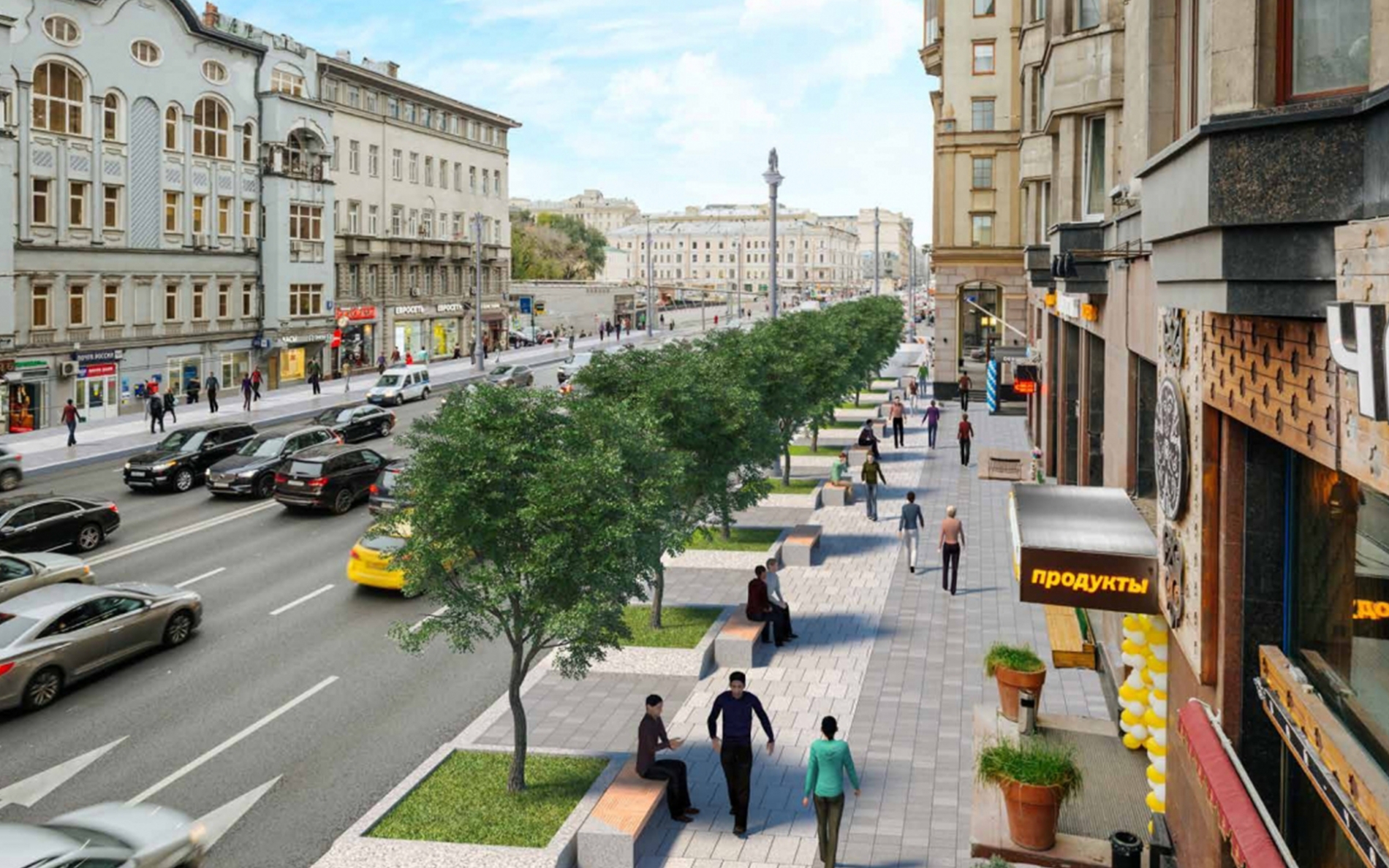 «Проект развивает идею восстановления «зеленого» облика Тверской улицы с высаживанием лип, разнообразным мощением и созданием более уютных и комфортных пространств для пешеходов», - сказала Т. Гук.