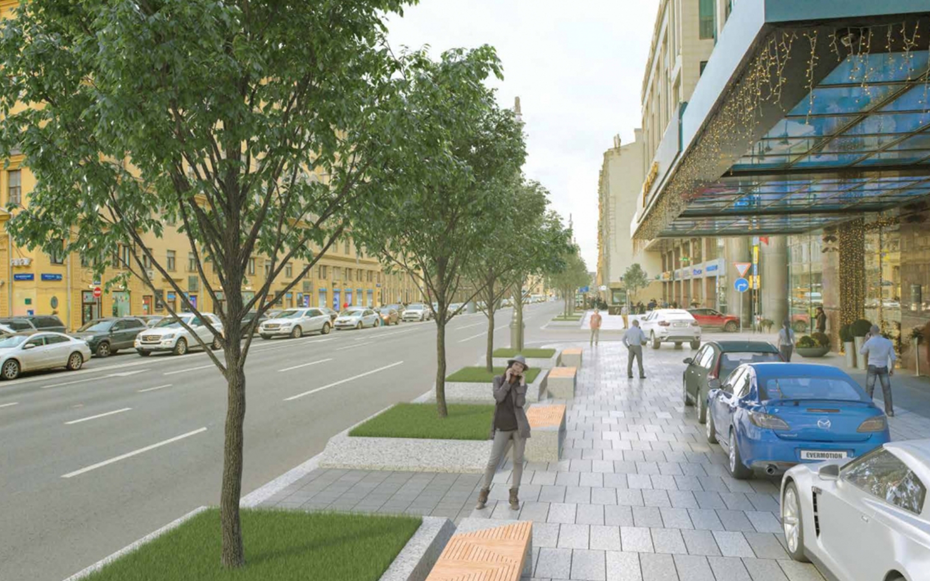Там, где позволяет ширина тротуара, появятся липы. Крупные деревья высотой 8-9 метров высадят с шагом 9 метров. Худсовет рекомендовал учесть при этом пешеходные потоки из подземных переходов и скопление людей у остановок общественного транспорта.