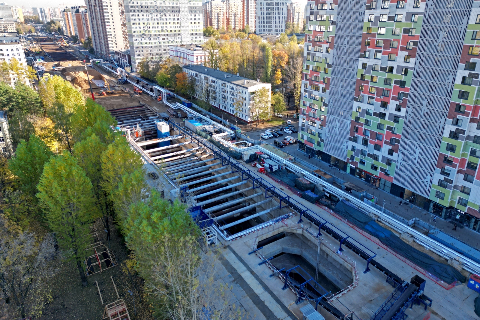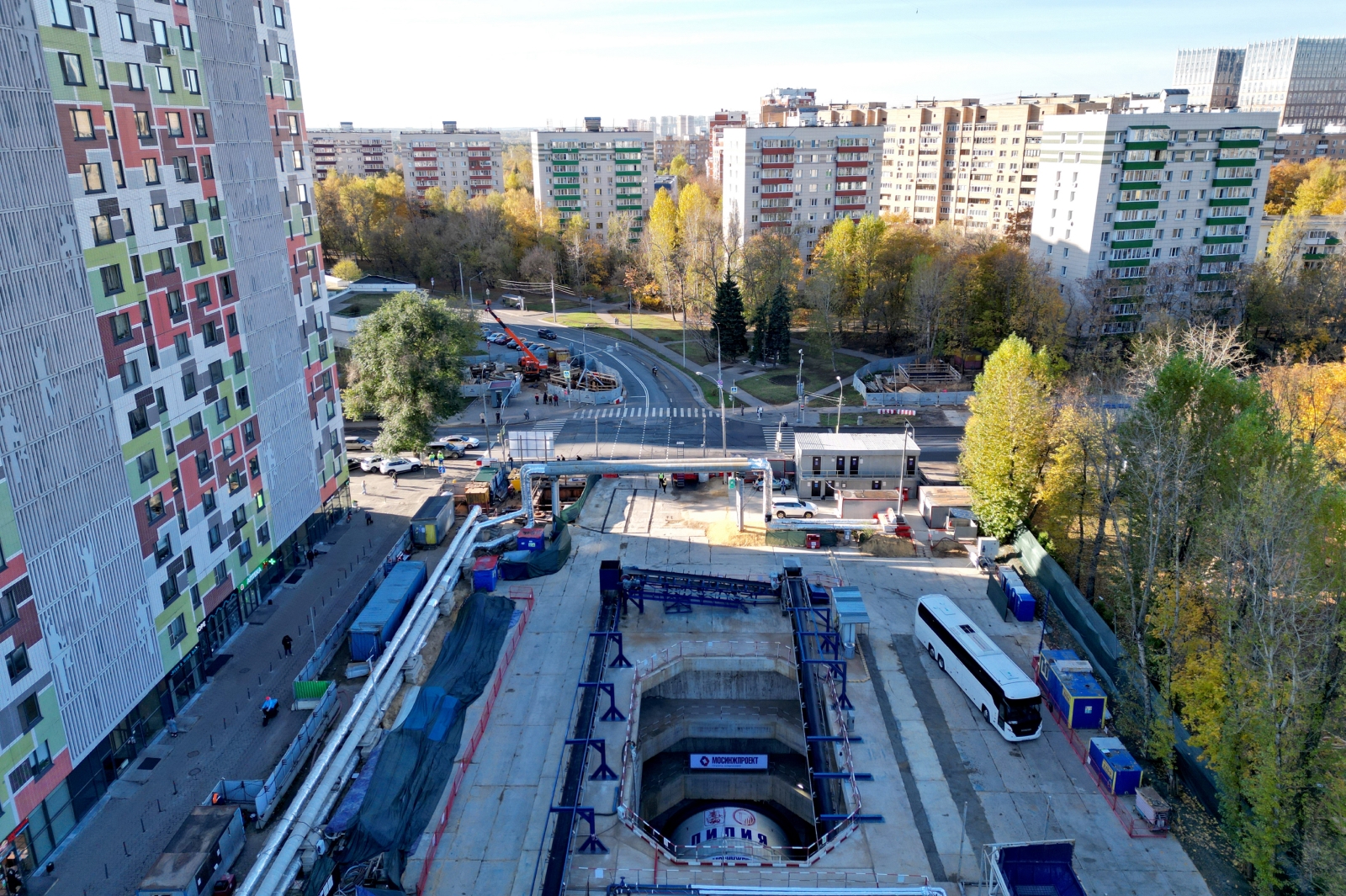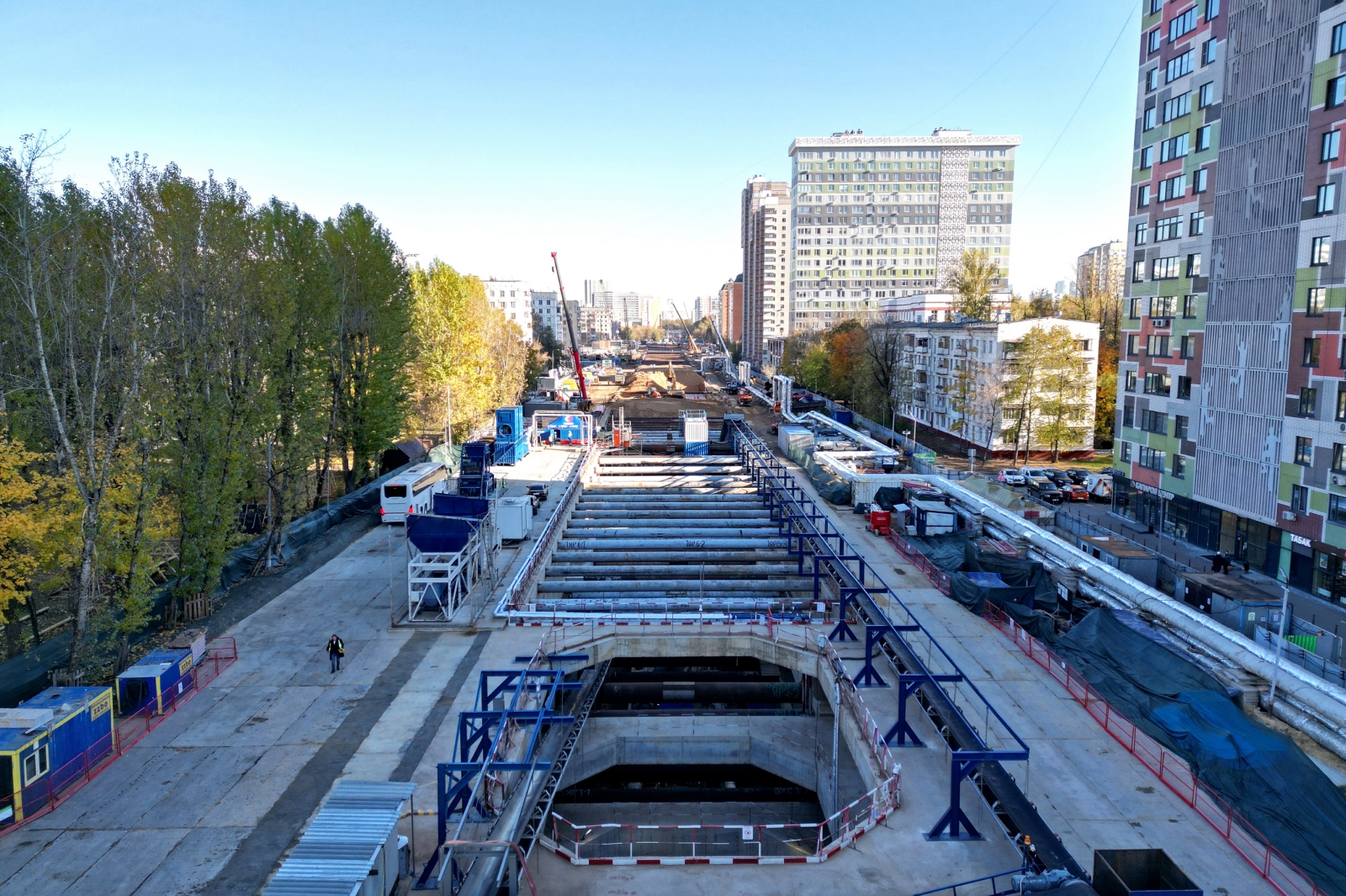 Сейчас выполняется устройство левой демонтажной камеры. Такой метод дает возможность работать в условиях плотной городской застройки на северо-западе Москвы, между двумя существующими тоннелями Большой кольцевой линии метро.