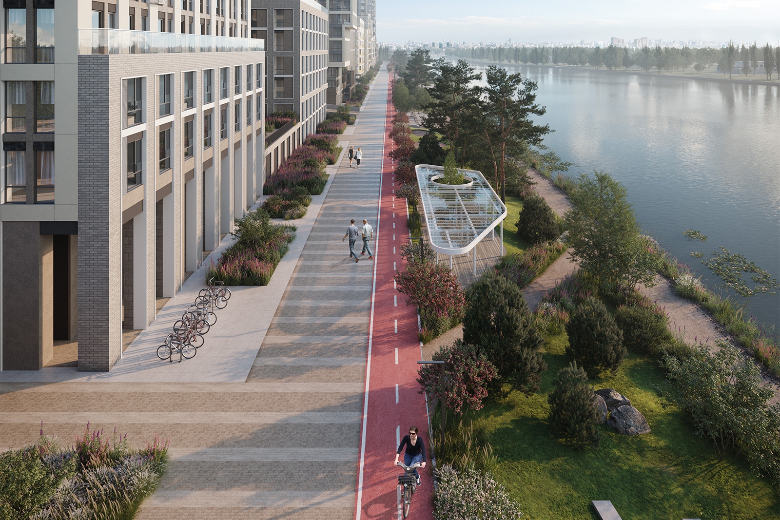 Главный архитектор Москвы Сергей Кузнецов пояснил, что набережная призвана стать центром притяжения горожан. К ней обращены фасады жилых корпусов, на нее выходят коммерческие помещения. В основе благоустройства лежит обеспечение естественной среды для человека и экологичность.